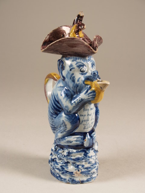 Melkkannetje met deksel in de vorm van een aap. Op zijn kop een driekantige steek met daarin een hoog dekseltje. De aap ...scriptie: 'Kees den aap dan gekkie geeft melk uijt zijn bekkie'.||Delft||onbekend||Keramiekmuseum Princessehof BP 2010-040 |
