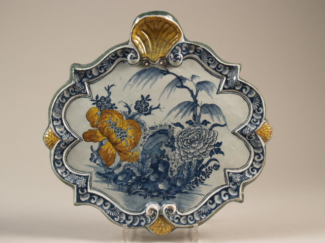 Ovale plaquette met regelmatig gebogen, verhoogde rand waaraan op de vier zijden, schelpversieringen in geel. Op de plaquette een voorstelling van een bloemstruik in blauw met een grote gele bloem. De rand is versierd in blauw met krullen en bloemen. De buitenrand is groen. (Nederlands)