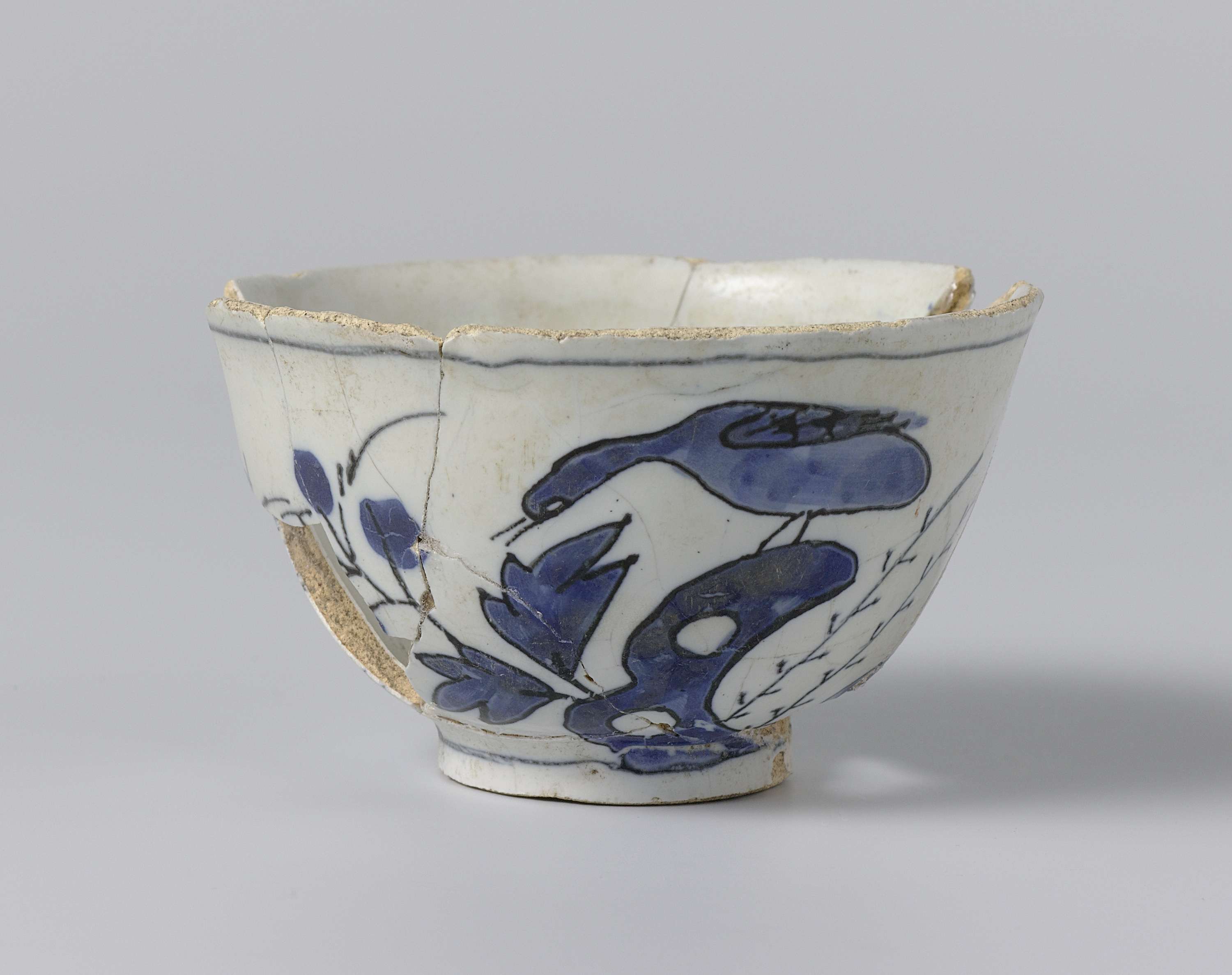 Kop van blauw beschilderde faience, beschilderd met grote bloemen en een vogel. De kop is een bodemvondst. (Nederlands)