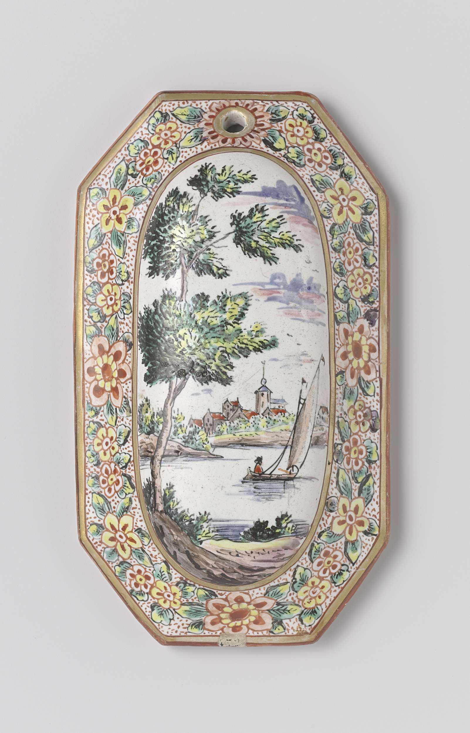 Achtkantige borstelrug veelkleurig beschilderd met een waterlandschap. (Nederlands)