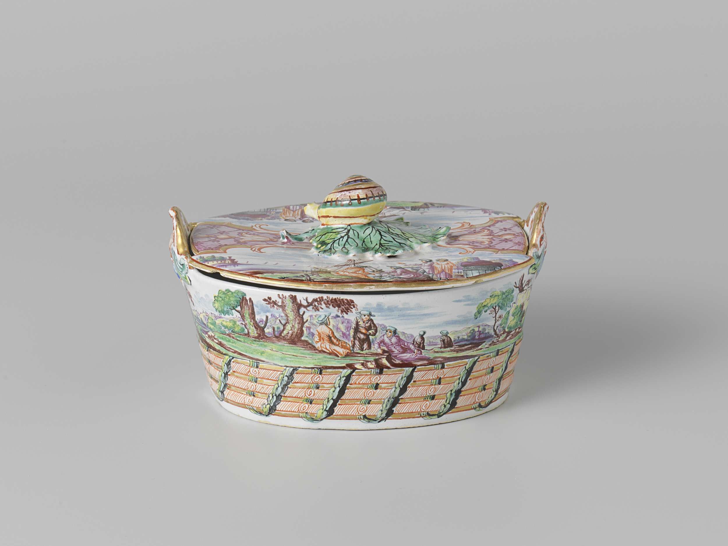 Botervloot met deksel met oren in de vorm van schelpen, veelkleurig beschilderd met twee op de rug geziene figuren bij een ruïne. van de deksel een slak. Gemerkt 5 in onderglazuurblauw (bodem) en 6 en 5 boven elkaar (binnenkant van de deksel). De vloot heeft het invnr. BK-1953-61-B-a en het deksel het invnr. BK-1953-61-B-b. (Nederlands)