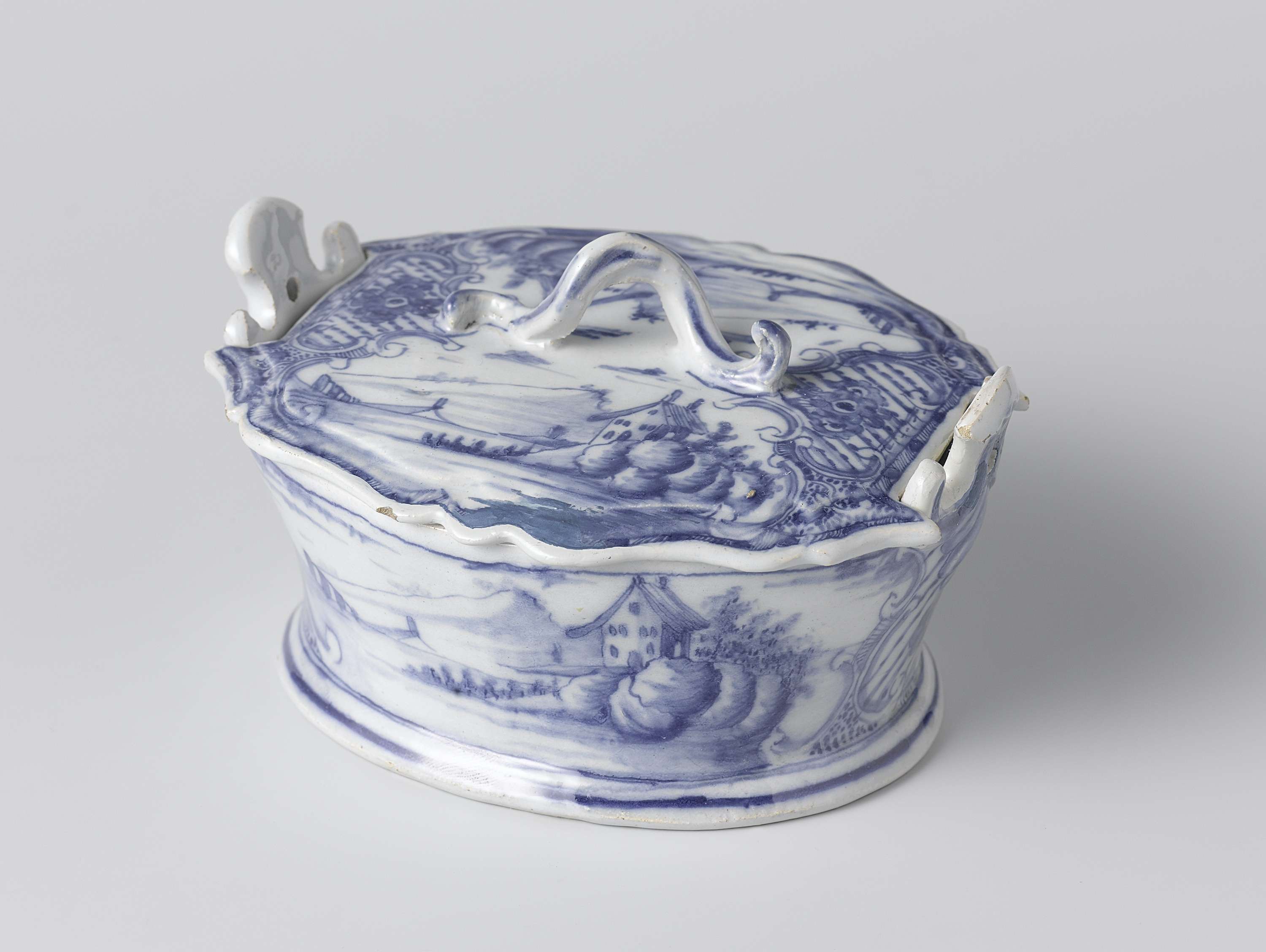 Een ovale botervloot en deksel beschilderd met berglandschappen. (Nederlands)