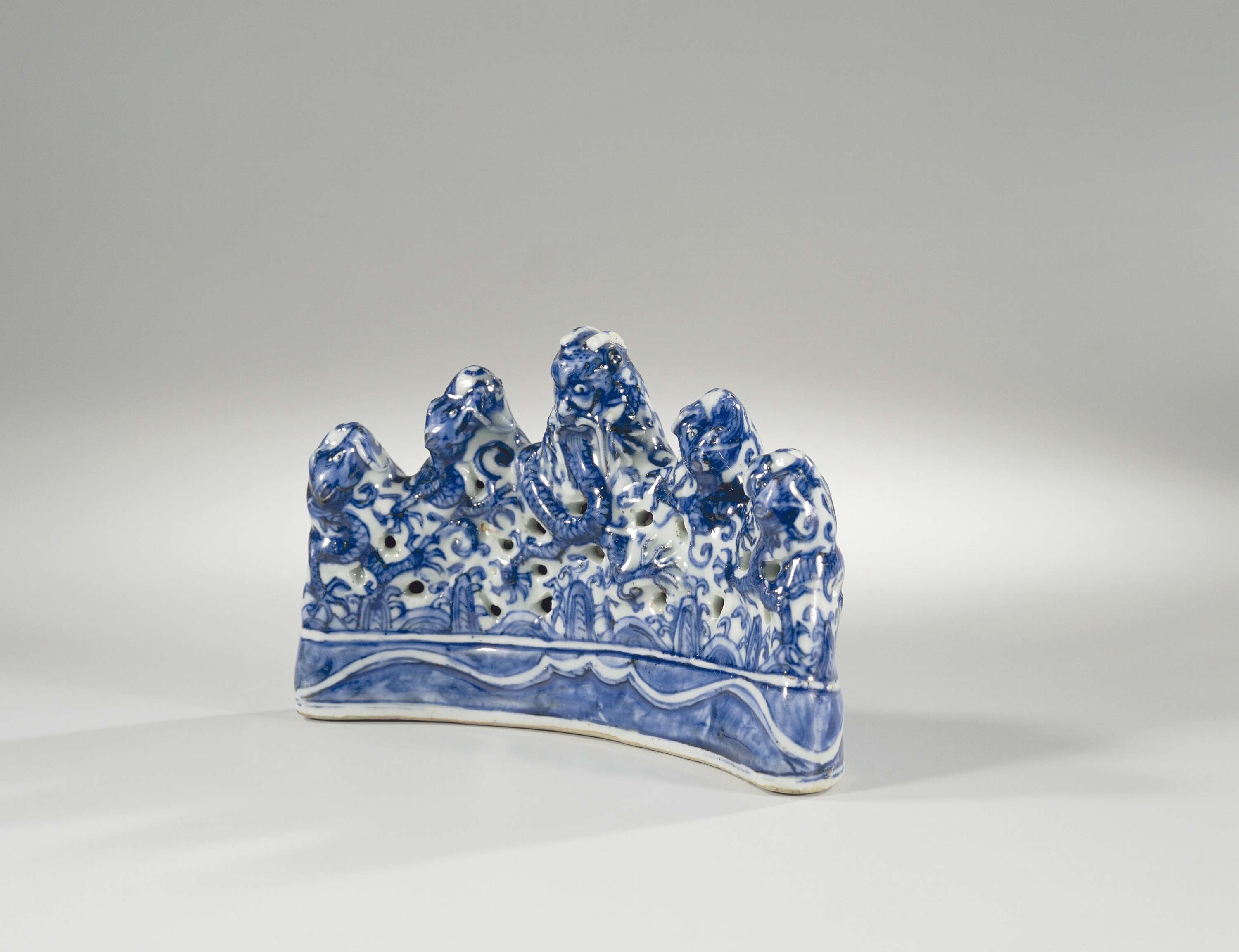 Penseelhouder van porselein, beschilderd in onderglazuur blauw. De houder heeft de vorm van een halfellipsvormige rotswand. Vijf vijf-klauwige draken, hun koppen uitstekend boven rotsen en golven, vormen de rotspunten; het bovenste deel met een aantal gaten; het onderste deel met een band onderglazuur blauw met daarin uitgespaard een gemodelleerde, geschulpte lijn. Gemerkt op de onderzijde met een zes-karaktermerk van keizer Wanli in een dubbele rechthoek. Ming porselein in blauw-wit. (Nederlands)