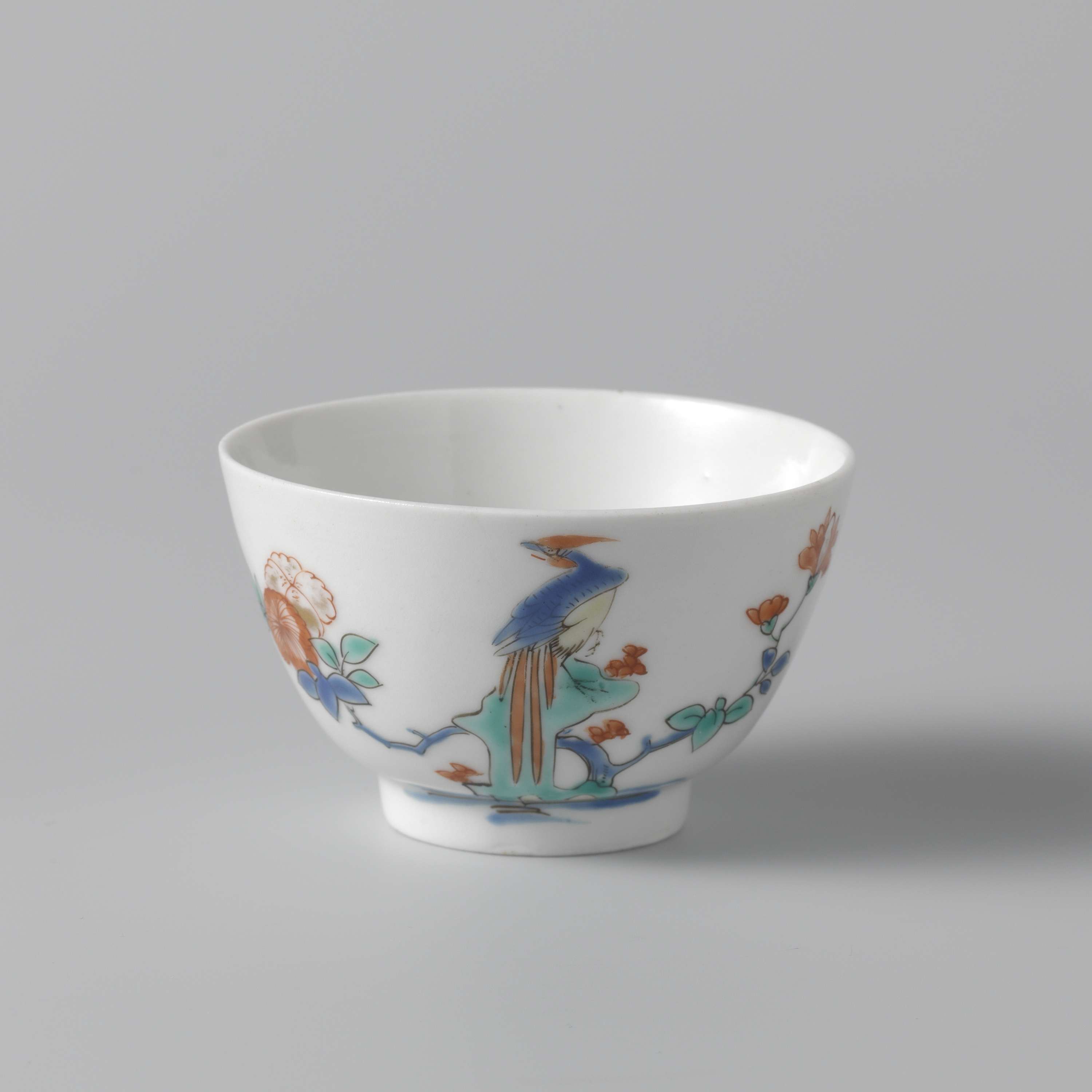 Ronde kop van porselein, beschilderd op het glazuur in blauw, rood, groen, geel, zwart en goud met een een paar hoo-vogels, een in de lucht en een op een rots met een bloemtak. Binnen op de bodem een rozet binnen een dubbele cirkel in rood en goud. Kakiemon-stijl. (Nederlands)