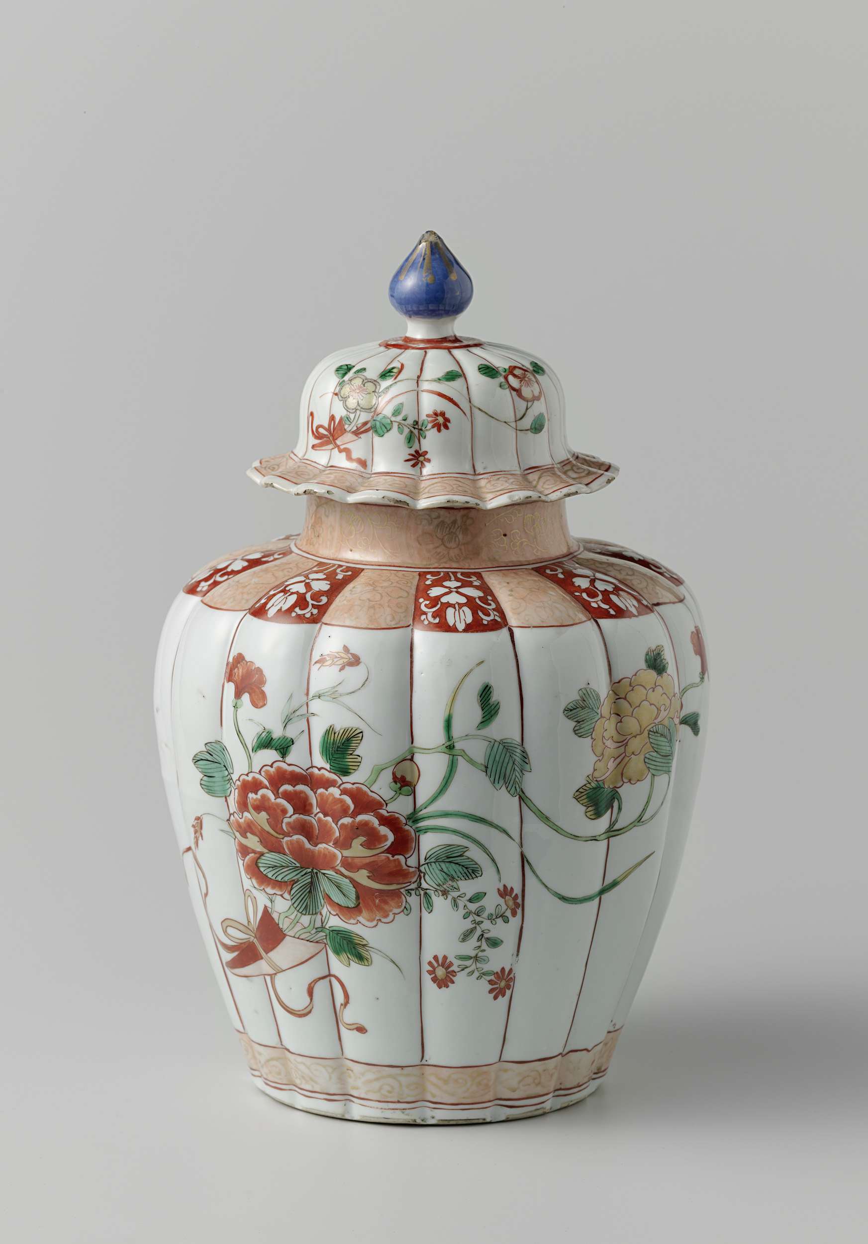Geribde dekselpot van porselein met gelobde dekselrand, beschilderd in onderglazuur blauw en op het glazuur rood, groen, geel, zwart en goud. Op de wand twee boeketten met bloemen, de stelen bij elkaar gebonden in een houder; rond de voet een band met krulwerk; op de schouder vakken afwisselend bedekt met rood met bloemranken in reserve en lichtrood met bloemranken in goud; op de nek lichtrood met lotusranken in goud. Deksel met dezelfde decoratie; rond de knop een band met losse bloemen en ruit met swastika in reserve tegen een rode grond. Famille verte. (Nederlands)