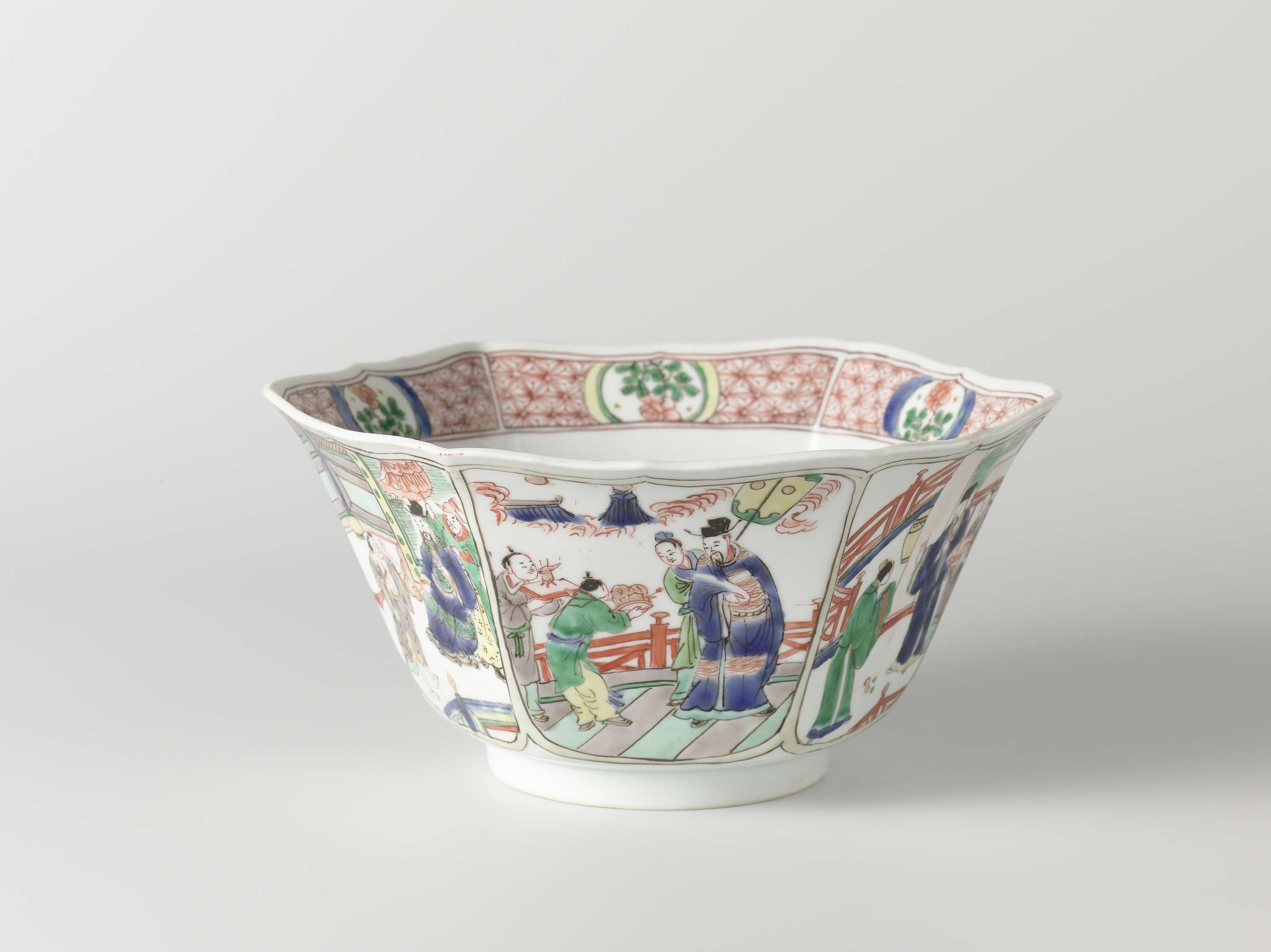 Zeskantige kom van porselein met spreidende wand en geschulpte rand, beschilderd in onderglazuur blauw en op het glazuur blauw, rood, groen, geel, aubergine, zwart en goud. De buitenzijde met in elk van de zes vakken een andere verhalende voorstelling over Lü Dongbin; op de bodem antuiquiteiten; de rand aan de binnenzijde met een geometrisch patroon afgewisseld met cartouches met bloemtakken. Op de onderzijde gemerkt met het zes-karaktermerk van keizer Chenghua. Een barst in de rand; meedere chips in de rand; chip in de voetring. Famille verte. (Nederlands)