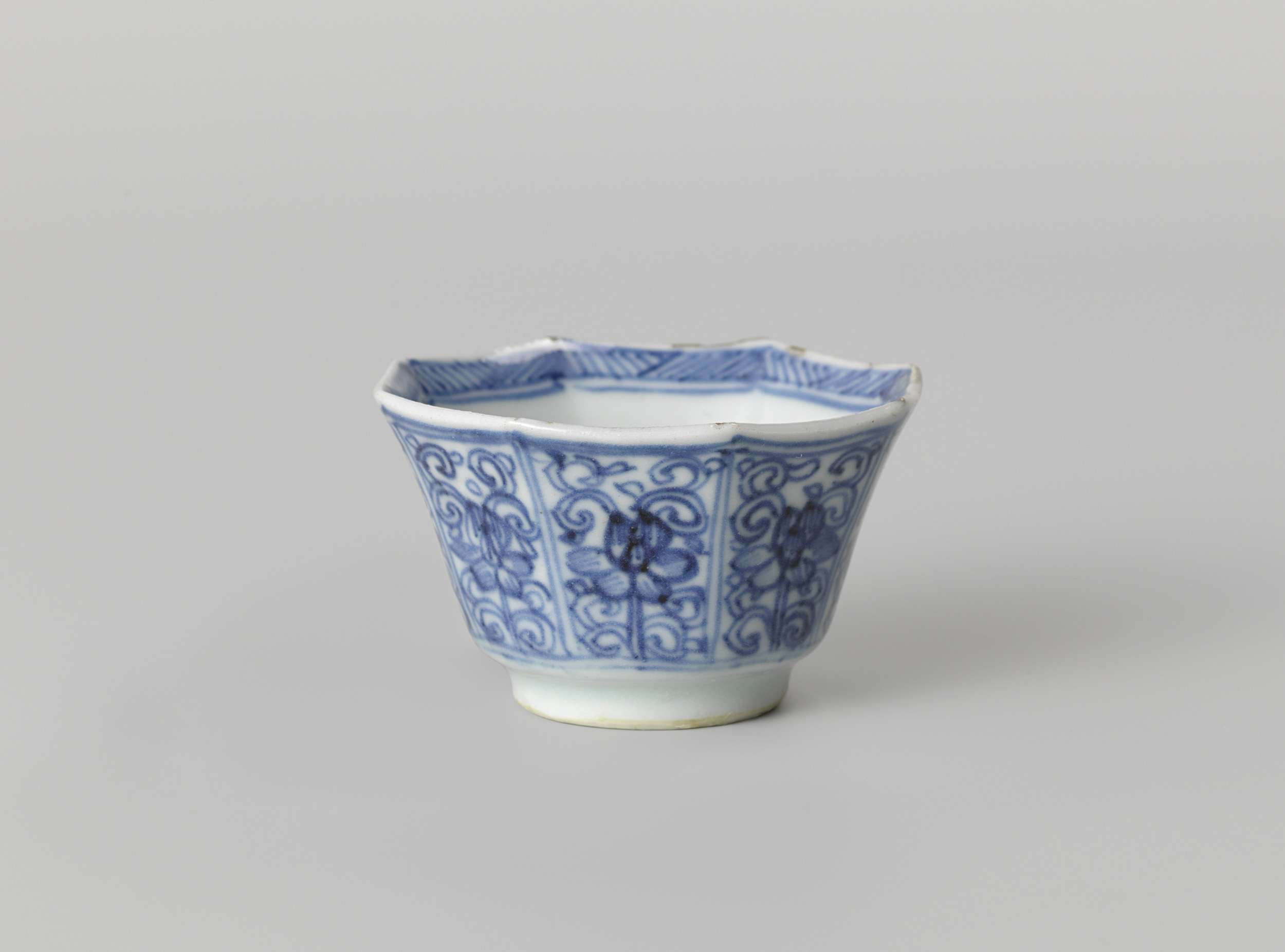 Achthoekige kop van porselein met een spreidende wand, beschilderd in onderglazuur blauw. Op de bodem een bloemtak in een dubbel medaillon; de binnenrand met een band met zigzag-werk. Op de buitenwand acht vakken met gestileerde bloemranken (lotus). Blauw-wit. (Nederlands)