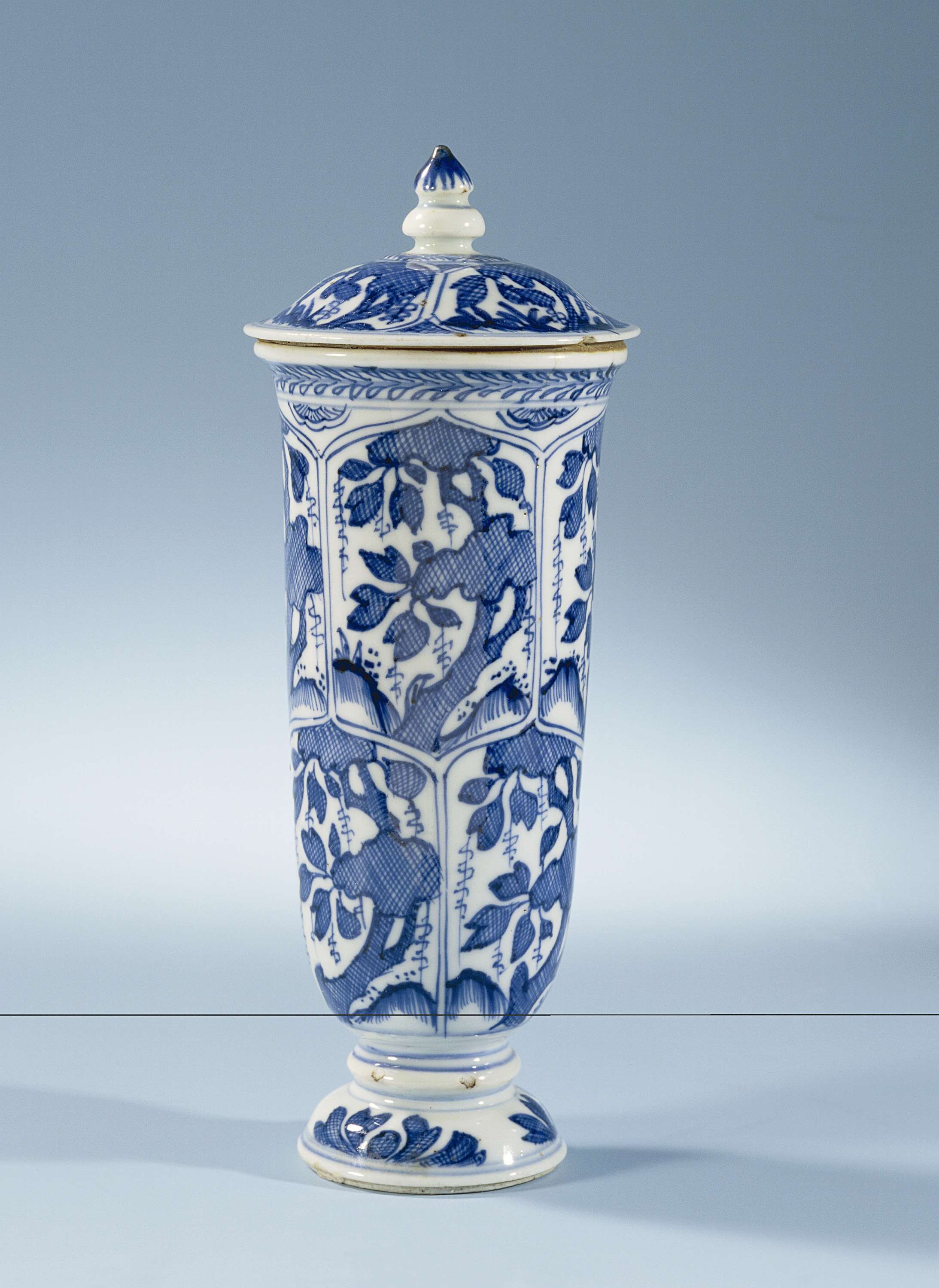 Hoge, klokvormige bekervaas met deksel van porselein; hoge, spreidende voet, beschilderd in onderglazuur blauw. Op de wand twee rijen met bloembladvormige vakken met daarin bloeiende planten aangezet met arceerwerk; tussen de vakken op de bovenste rij telkens een halve bloem; de rand met een doorlopende bladrank; op de voet driemaal een gestileerde bloem. De deksel met dezelfde decoratie. Deksel is vastgelijmd. Blauw-wit. (Nederlands)