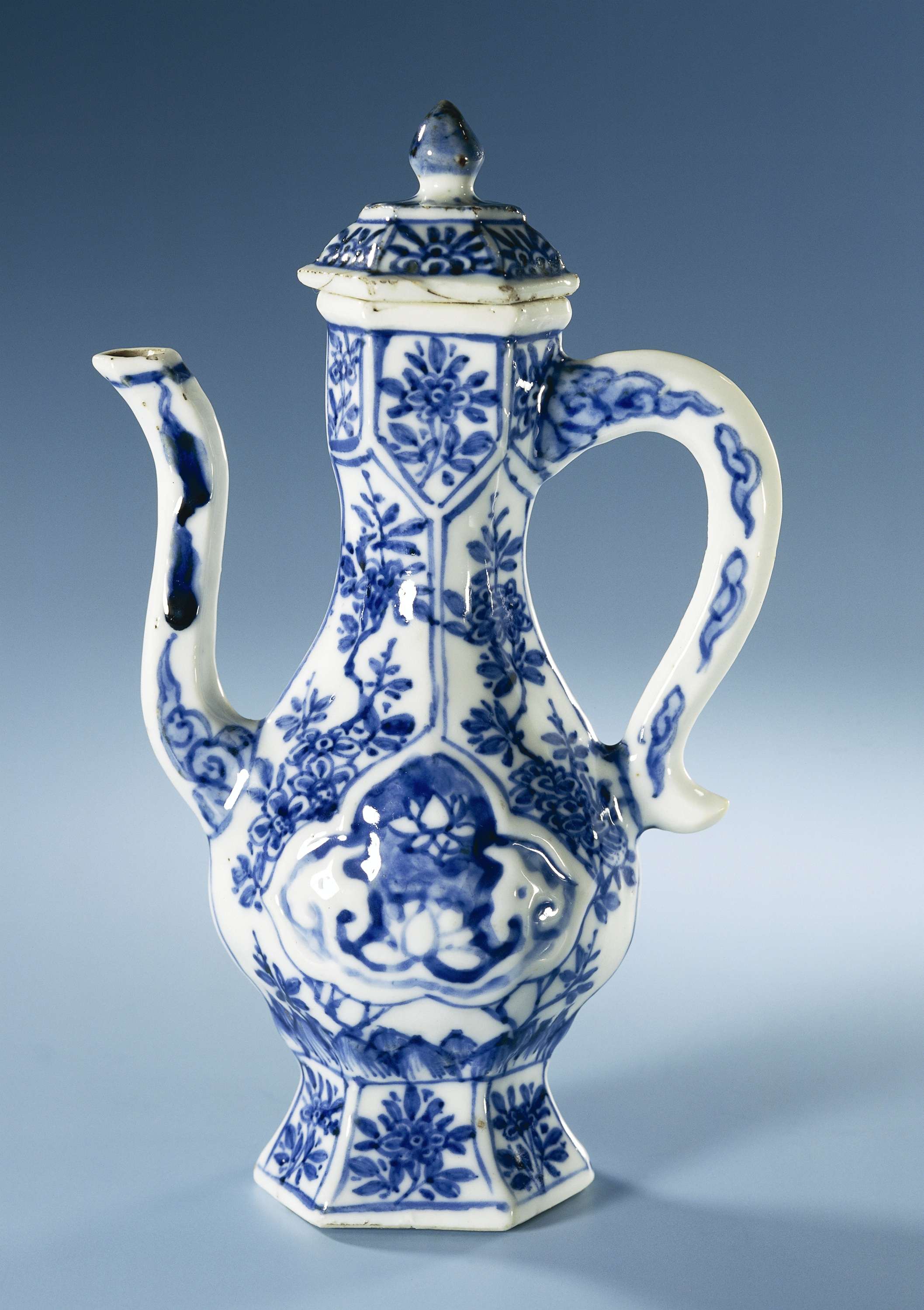 Zeshoekige kan van porselein met een peervormig lichaam, lange, S-vormige tuit en S-vormig oor, beschilderd in onderglazuur blauw. Op de buik bloeiende planten onderbroken door een gemodelleerd, gelobd cartouche met één gemodelleerde en één in blauw uitgespaarde lotusrank. De voet, rand en deksel zijn verdeeld in zes vakken met bloemtakken. Op de tuit en het oor wolkmotieven. Blauw-wit. (Nederlands)