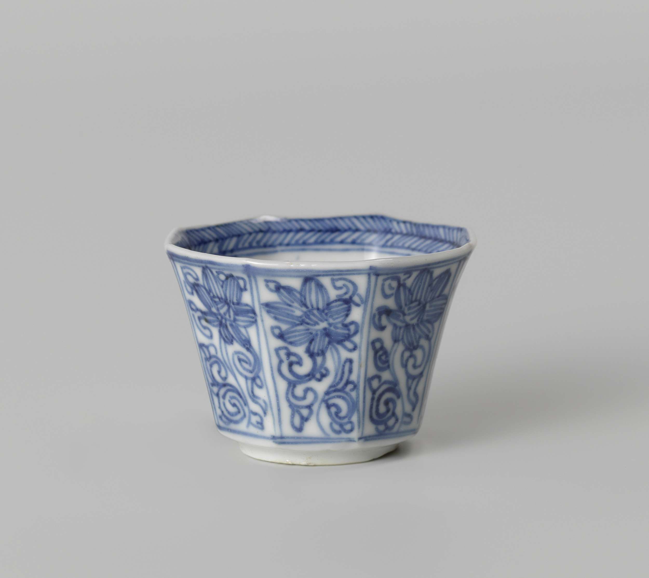 Achthoekige kop van porselein, beschilderd in onderglazuur blauw. Op de buitenwand in elk van de acht vakken een lotusrank. De bodem met een achthoekig medaillon met een lotusrank en op de binnenrand een bladrank. Blauw-wit. (Nederlands)