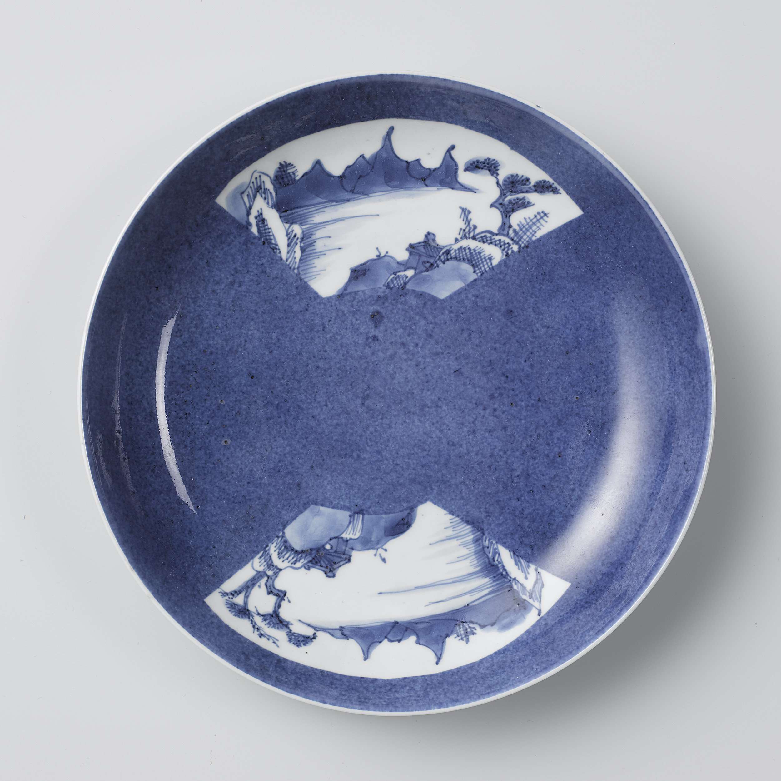 Schaal van porselein, gedecoreerd in onderglazuur blauw. De schaal is aan de voorzijde bedekt met bleu poudré (poederblauw) met twee uitgespaarde, waaiervormige vakken met een rivierlandschap met bergen, rotsen en een pijnboom. De buitenwand met driemaal een bloemtak. Gemerkt op de onderzijde met een paddenstoel (lingzhi) in een dubbele cirkel. Bleu poudré met blauw-wit. (Nederlands)