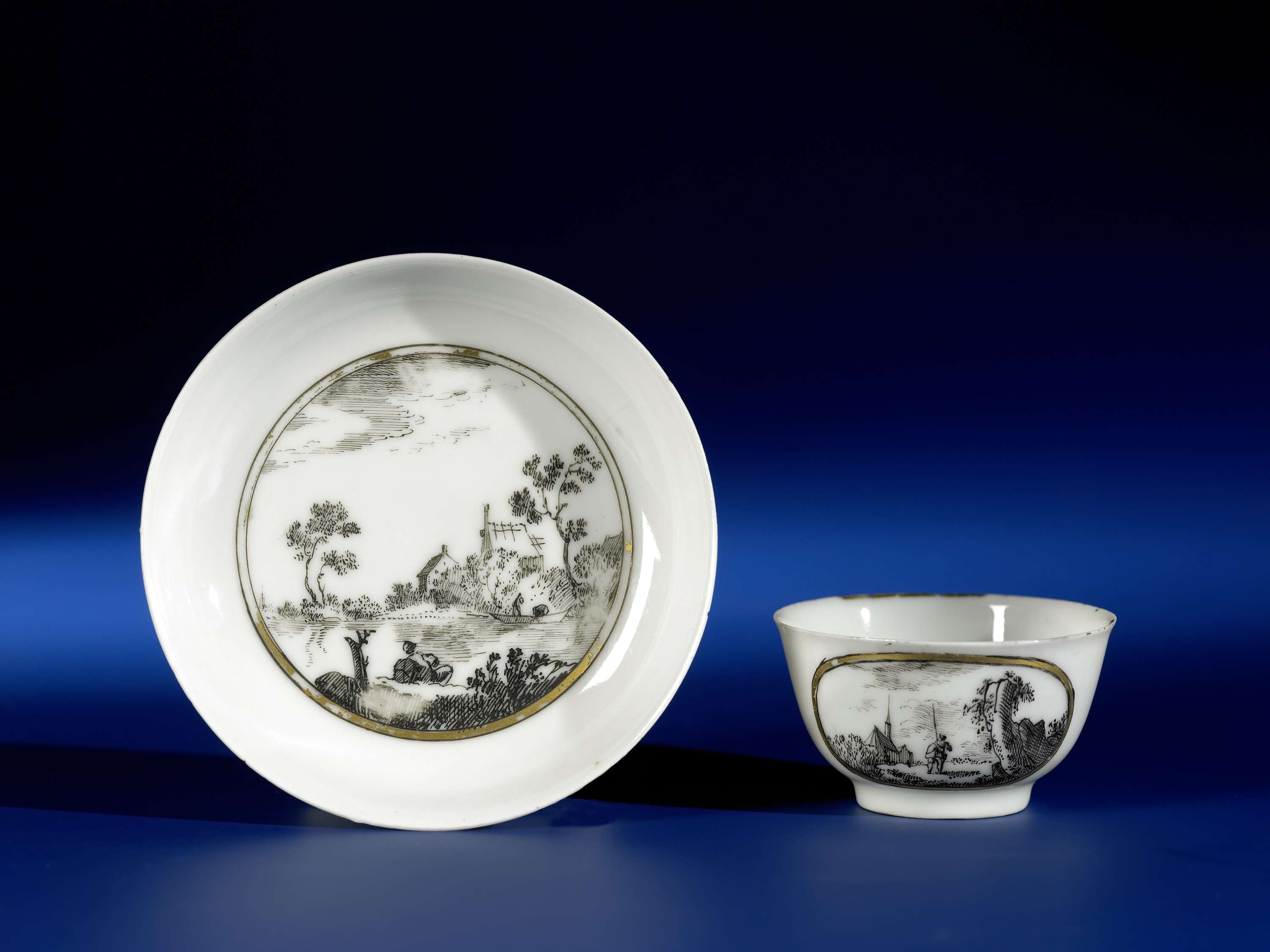 Klokvormige kop en schotel van porselein beschilderd op het glazuur in zwart en goud. Op het plat van de schotel een medaillon met een Europees landschap met huizen aan een rivier waarin een bemande boot vaart, op de voorgrond een liggende man aan de oever; de kop met tweemaal een Europees landschap met bomen en personen in een ovaal medaillon; op de bodem een huis tussen bomen achter een heuvel. Een barst in de wand van de kop. Mogelijk in Europa gedecoreerd. Europese voorstellingen in encre de Chine. (Nederlands)