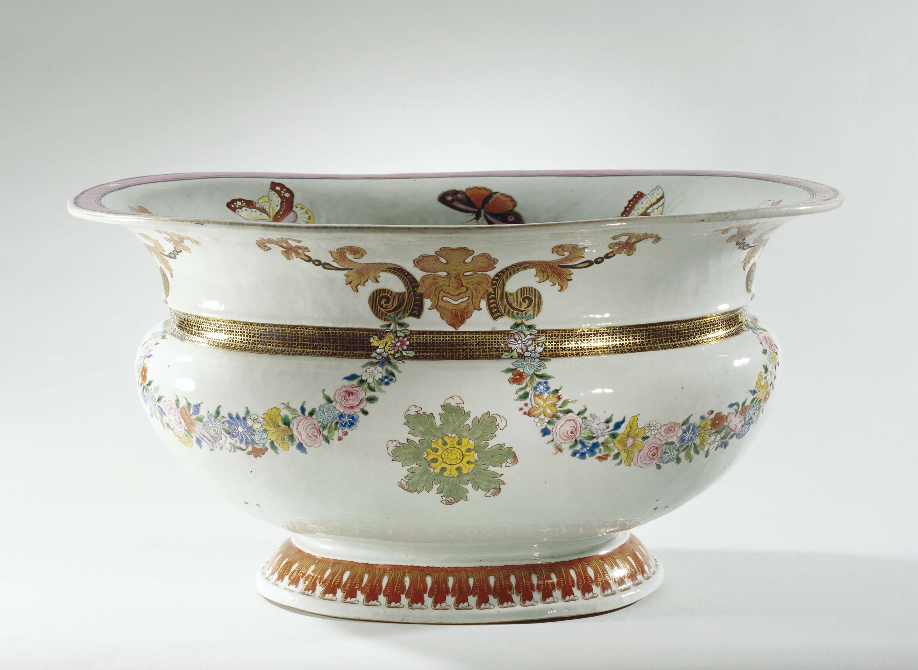 Groot ovaal basin van porselein, beschilderd op het glazuur in blauw, rood, roze, groen, geel, zwart en goud. Op de buitenrand vier maskers geflankeerd door voluten en bladranken. De maskers worden onderling verbonden door guirlandes en onder elk masker is een gestileerde bloemrozet op de buik. Op de voet een band met gestileerde bladmotieven. De binnenzijde met vier grote pioentakken en vlinders. Europese voorstelling in emailkleuren. N.B. Ook geregistreerd als BK-1957-45. (Nederlands)