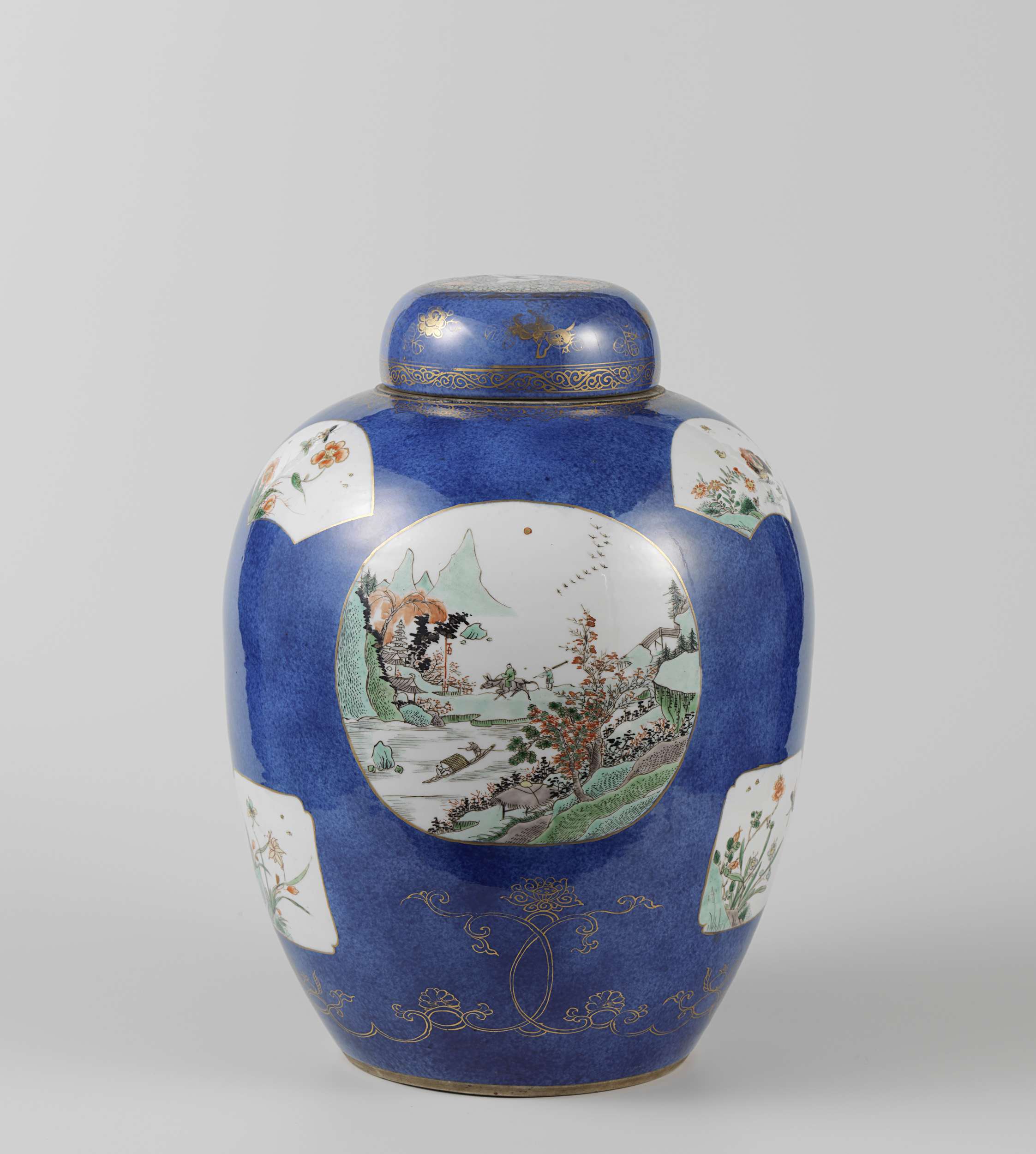 Eivormige pot met deksel van porselein, beschilderd in onderglazuur blauw en op het glazuur rood, groen, geel, aubergine, zwart en goud. De pot is bedekt met bleu poudré (poederblauw) met op de wand drie grote medaillons in reserve gevuld met antiquiteiten (vaas, ruyi-scepter, wierrookbrander, boeken) en dieren (vogel, shishi/leeuwhond, haas), een bloemenmand, personen in een rivierlandschap met bergen, bomen en paviljoens; tussen de medaillons telkens een waaiervormig en een vierkant cartouche met ingeknepen hoeken gevuld met bloemtakken en insecten; in goud om de voet een bloemrank en op de schouder een band met ruyi-motief; op de onderzijde een dubbele cirkel. De deksel met bleu poudré en een medaillon in reserve met krulwerk en een jongen (zotje) hangend aan een bloemtak tegen een groene achtergrond, de wand met bloemtakken en een decoratieve band in goud. Bleu poudré met famille verte. (Nederlands)