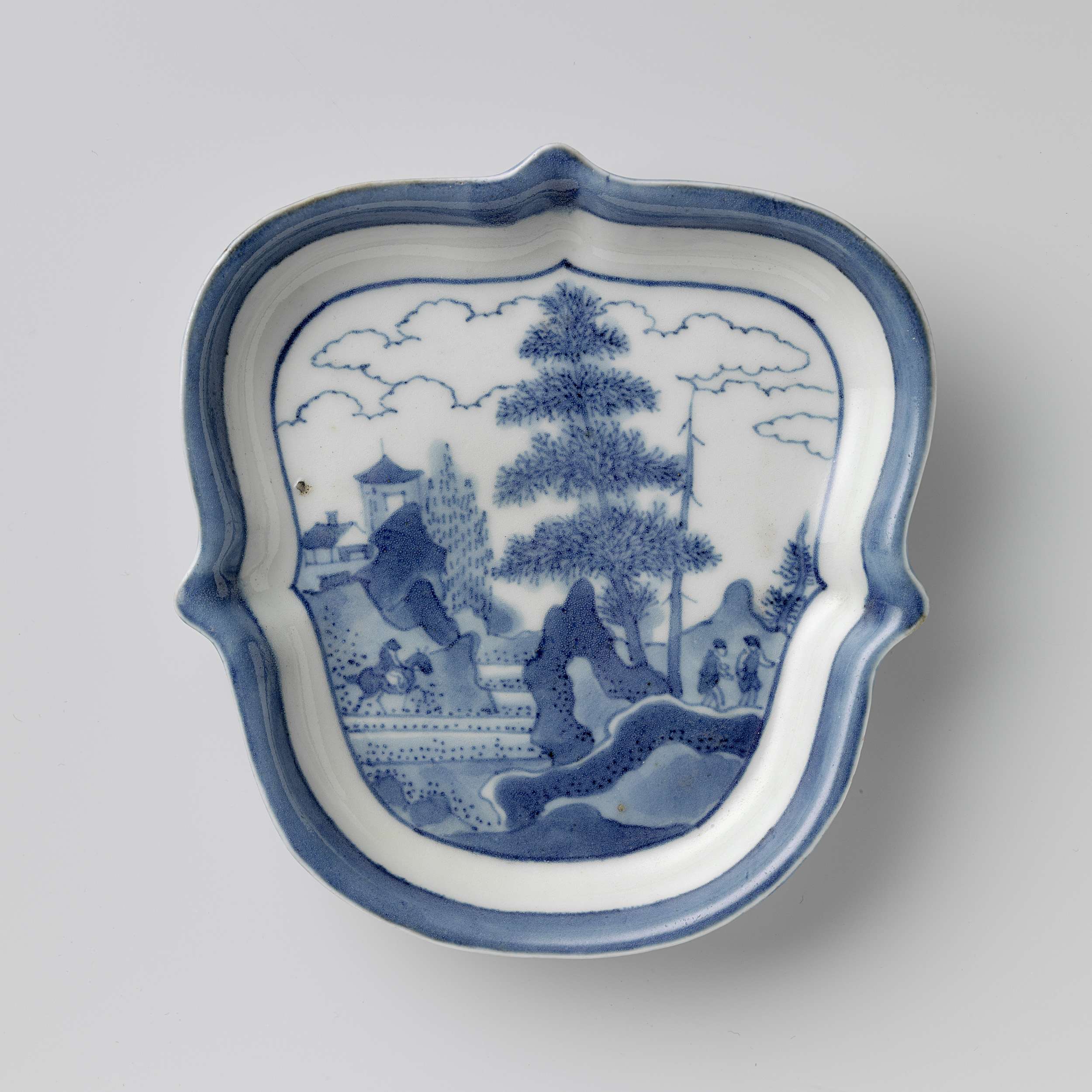 Schaal van porselein met accoladevormige wand en rand, beschilderd in onderglazuur blauw. Op het plat een landschap met daarin een ruiter en twee lopende mensen tussen rotsen en bomen. Op de achtergrond twee paviljoens en wolken. De binnenrand is met een blauwe band. Gemerkt op de onderzijde met het zes-karaktermerk van keizer Chenghua. Drie proenen op de onderzijde. Arita, blauw-wit. (Nederlands)
