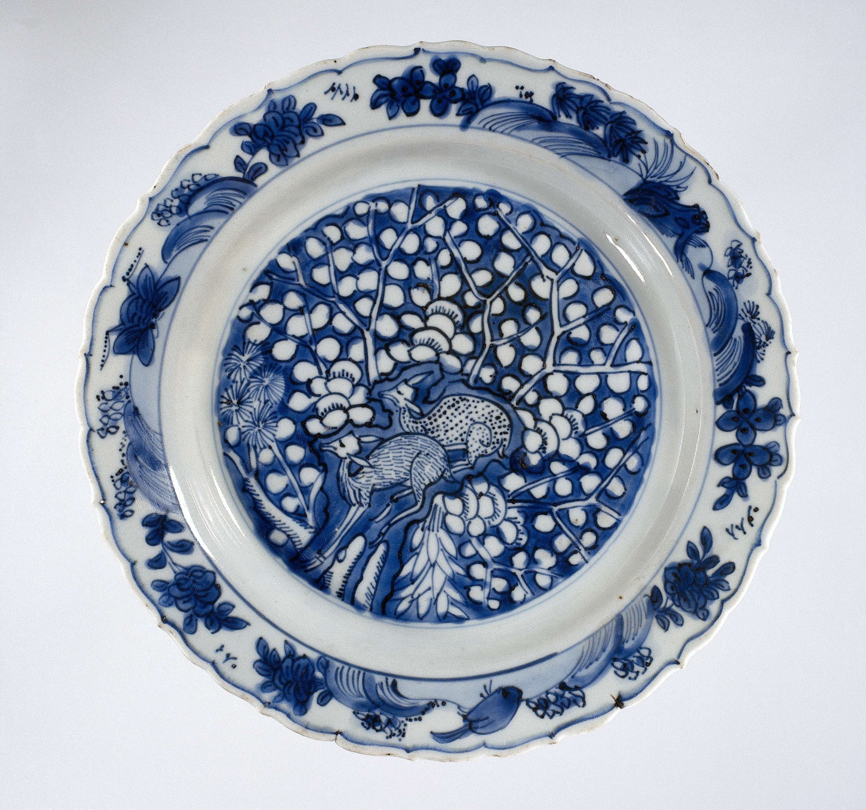 Bord van porselein met een geschulpte rand, beschilderd in onderglazuur blauw. Op het plat uitgespaard in een blauwe achtergrond twee herten naast een rots bij bloeiende bomen; op de rand drie groepen rotsen met planten met een vogel, kikker of een vlinder; de buitenrand met drie bloemtakken; de buitenwand met tweemaal een vogel op een tak. Een chip in de rand. Kraakporselein in blauw-wit. (Nederlands)