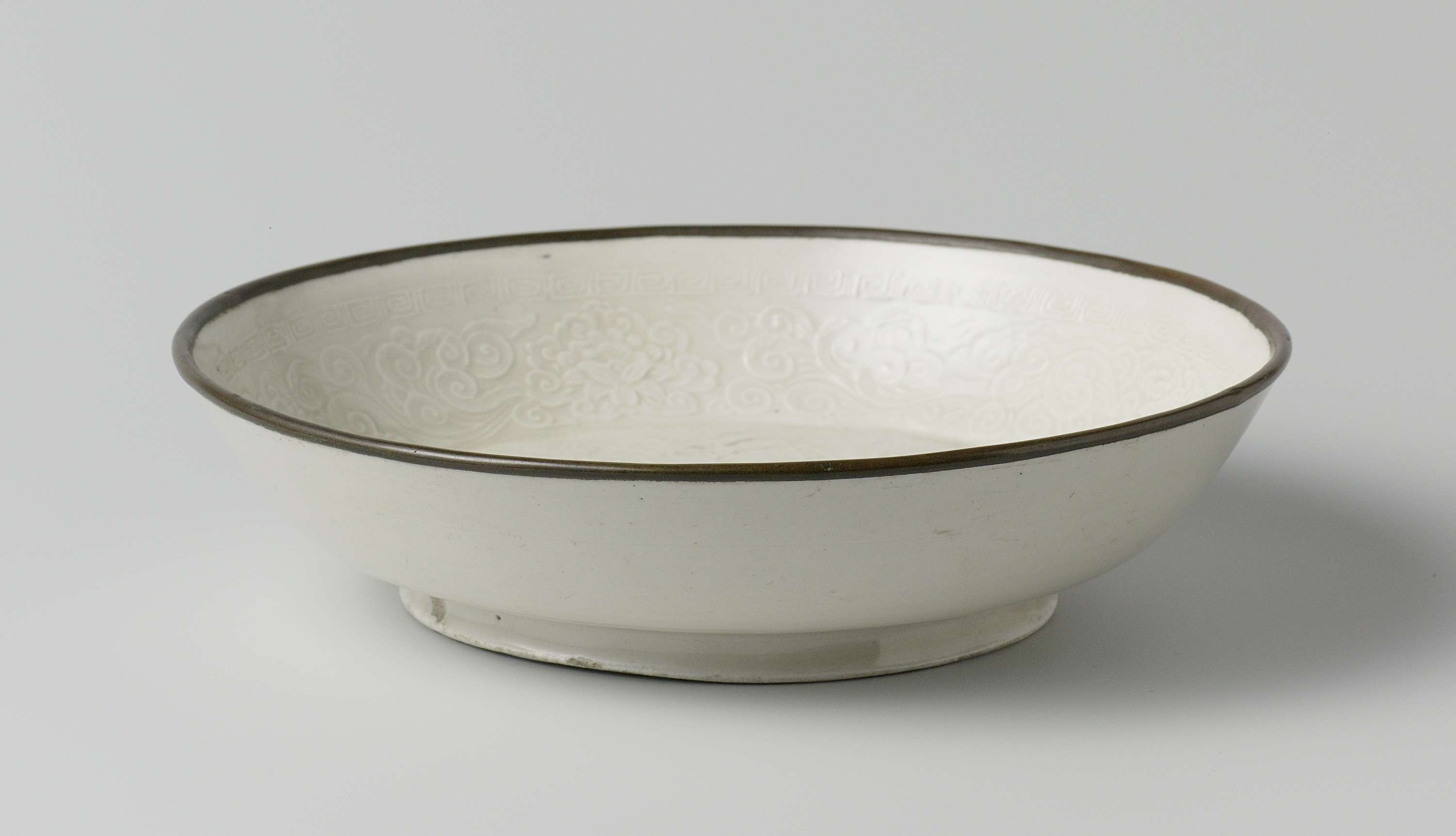 Schaal van steengoed, bedekt met een doorschijnend, iets grijzig glazuur. Op de voorzijde een geperste decoratie met op het plat twee draken tussen wolken. De binnenwand met een band met bloemranken en daarboven een band met een meanderpatroon. De rand is gevat in een metalen band. Ding. (Nederlands)