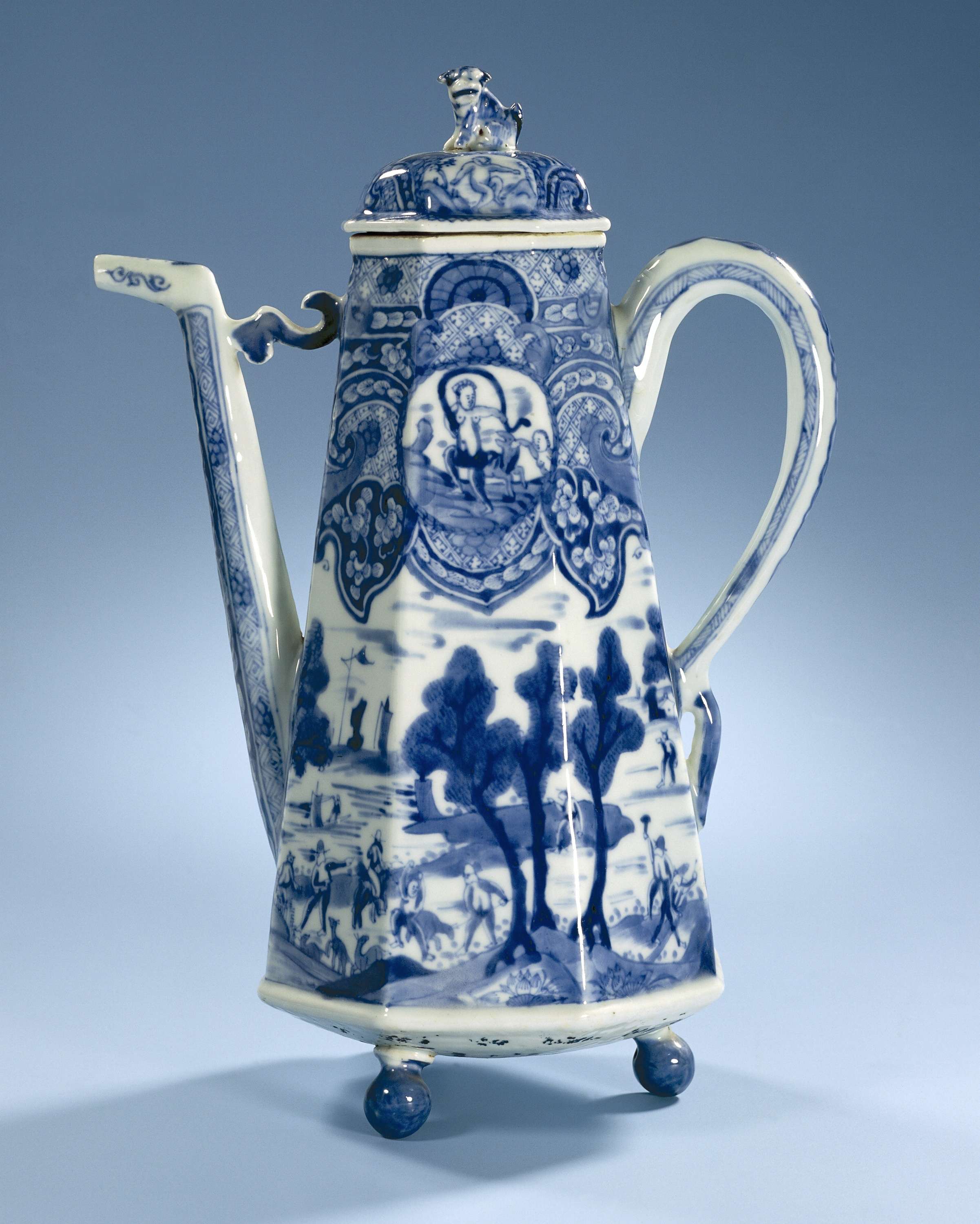 Achthoekige koffiekan van porselein op drie bolvormige voeten, een taps toe lopend lichaam met rechte wanden en c-vormig oor, beschilderd in onderglazuur blauw. De lange tuit is op het einde naar buiten gebogen en aan de bovenzijde met een S-vormig element met het lichaam verbonden. De wand is verdeeld in twee delen. De onderzijde met een doorlopende voorstelling van een jachtgezelschap in een landschap. De bovenzijde bestaat uit een brede, decoratieve band met krulwerk, schelpmotieven, servetwerk, bloemranken en twee cartouches met daarin de mythologische voorstelling van Europa en de stier. De tuit en het oor met decoratieve banden; de bovenzijde van het oor met een gat voor een montuur. De onderzijde van de kan met een afgesleten, geschilderde (Europese?) decoratie van bloemranken en medaillons. De deksel met dezelfde decoratie, maar dan met een putto in de cartouches. Dekselknop in de vorm van een shishi (leeuwhond). Europese vorm en voorstelling in blauw-wit. (Nederlands)