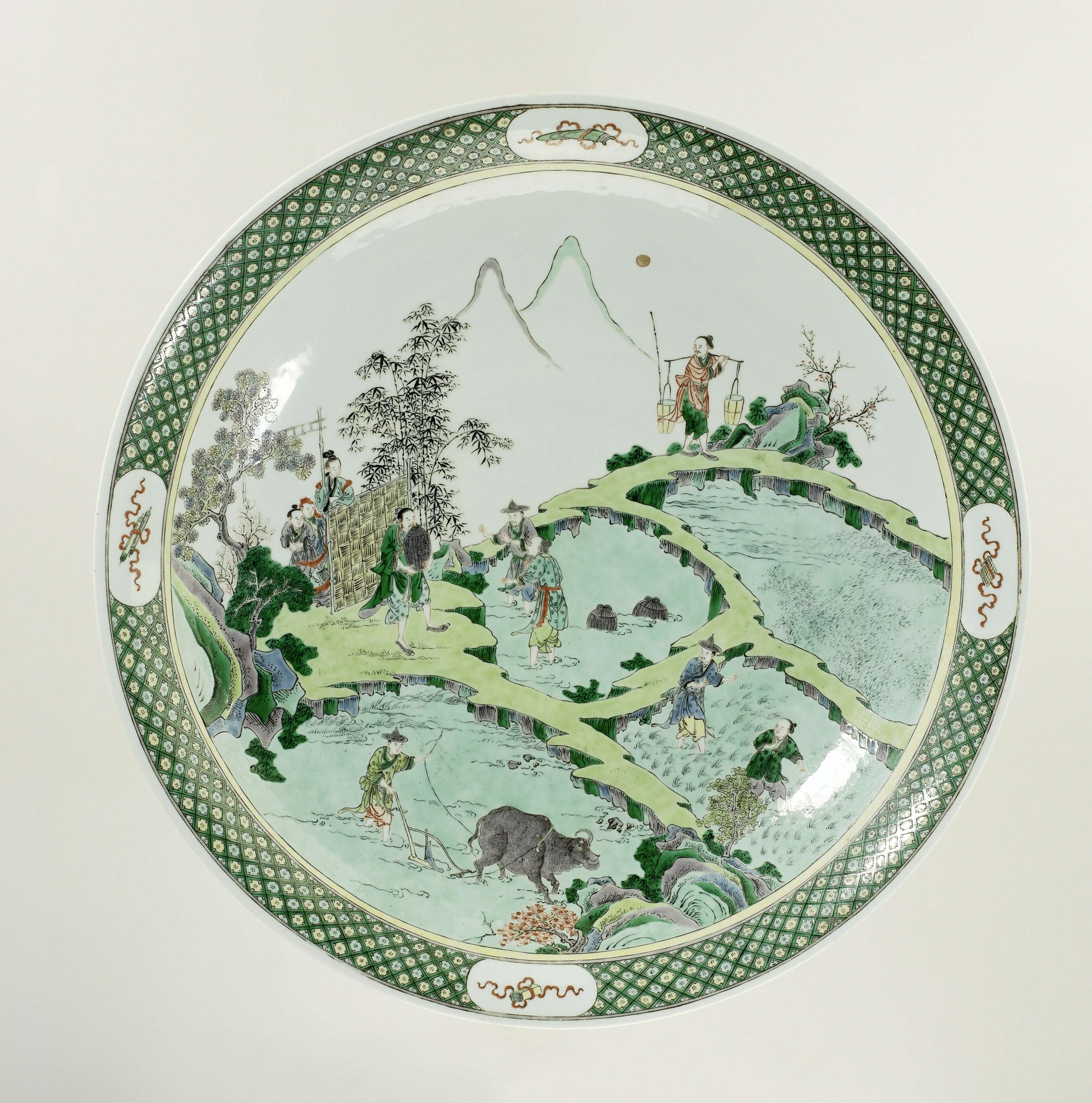 Bord, famille verte, versierd met een synoptische voorstelling van de verschillende fasen van de natte rijstbouw. (Nederlands)