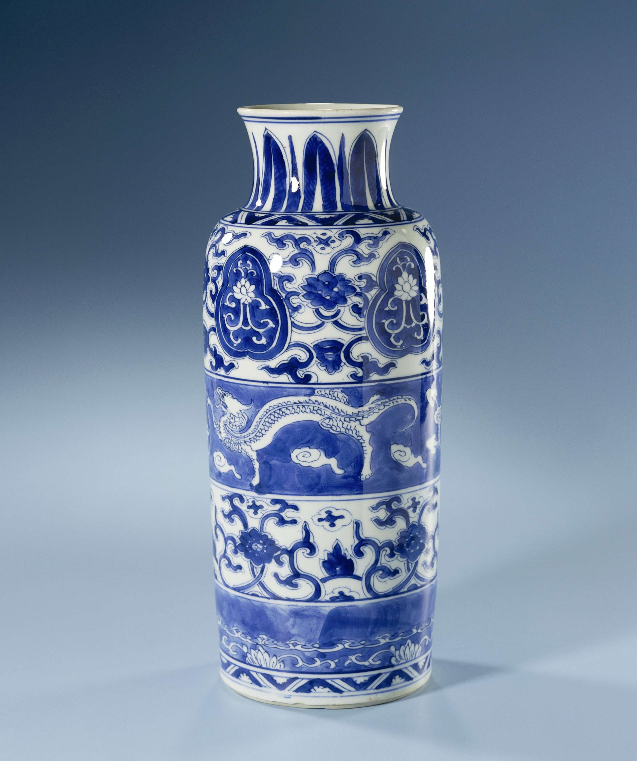 Cilindrische vaas van porselein met een wijde, spreidende nek, beschilderd in onderglazuur blauw. De buik is verdeeld in vier brede banden met van onder naar boven: een band met uitgespaarde lotusranken, één met bloemranken, één met twee chilongs (hoornloze draak) met een paddenstoel (lingzhi) tussen wolken en één met bloemranken onderbroken door een uitgespaarde lotusrank in een gelobd cartouche. Op de schouder en boven de voet een band met een zigzag-patroon met bloemen. De nek met staande, puntige bladmotieven. Blauw-wit. (Nederlands)