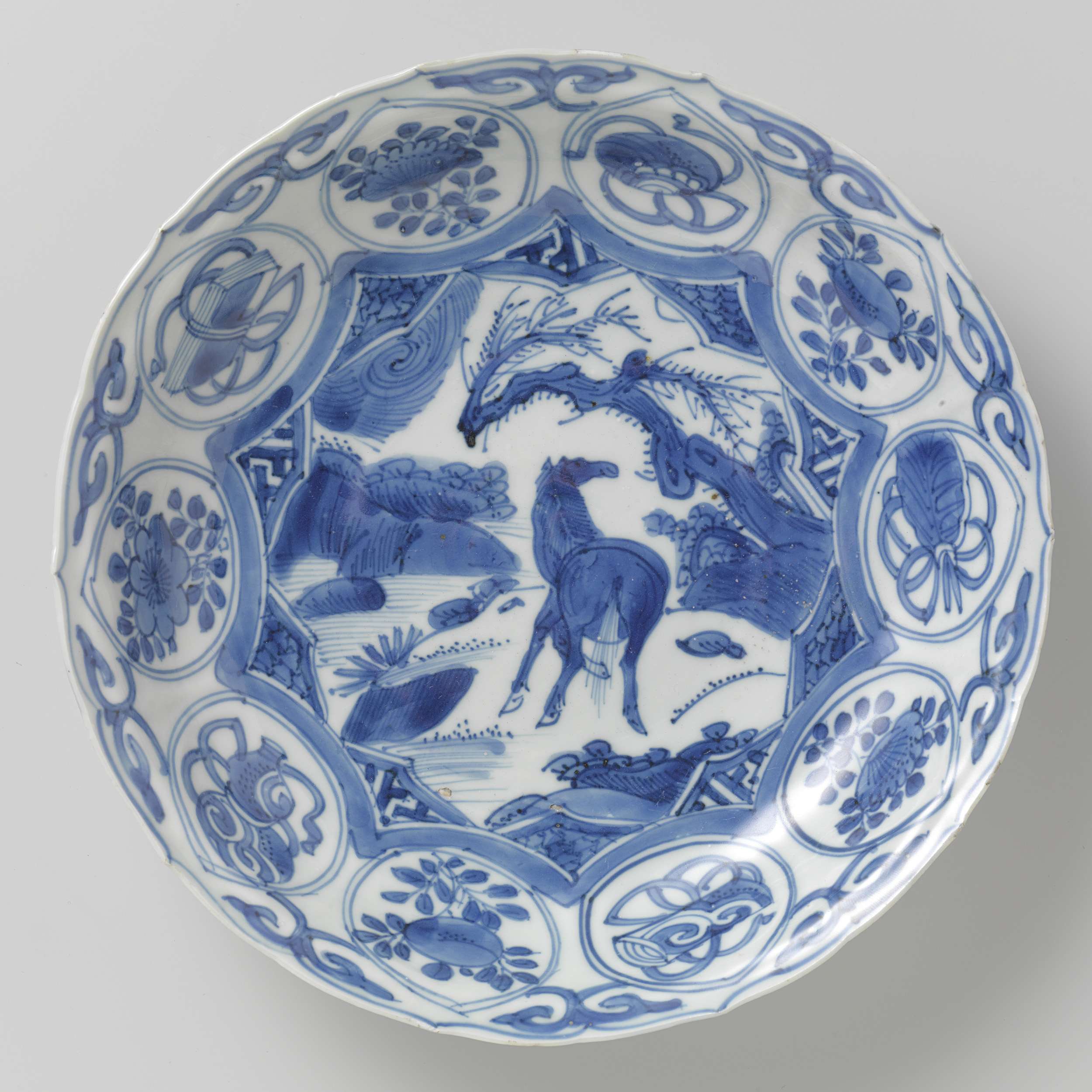 Schaal van porselein met een geschulpte rand, beschilderd in onderglazuur blauw. Op het plat een stervormig cartouche met daarin een paard, verkort gezien vanaf de achterzijde, in een landschap met rotsen en bomen. De hoeken van het cartouche met servetwerk. De rand is verdeeld in medaillons met bloemtakken of gelukssymbolen (boek, parel, artemisiablad, rol, kalebaskruik); tussen de medaillons ranken. De buitenwand is verdeeld in vakken met stippen. Kraakporselein in blauw-wit. (Nederlands)