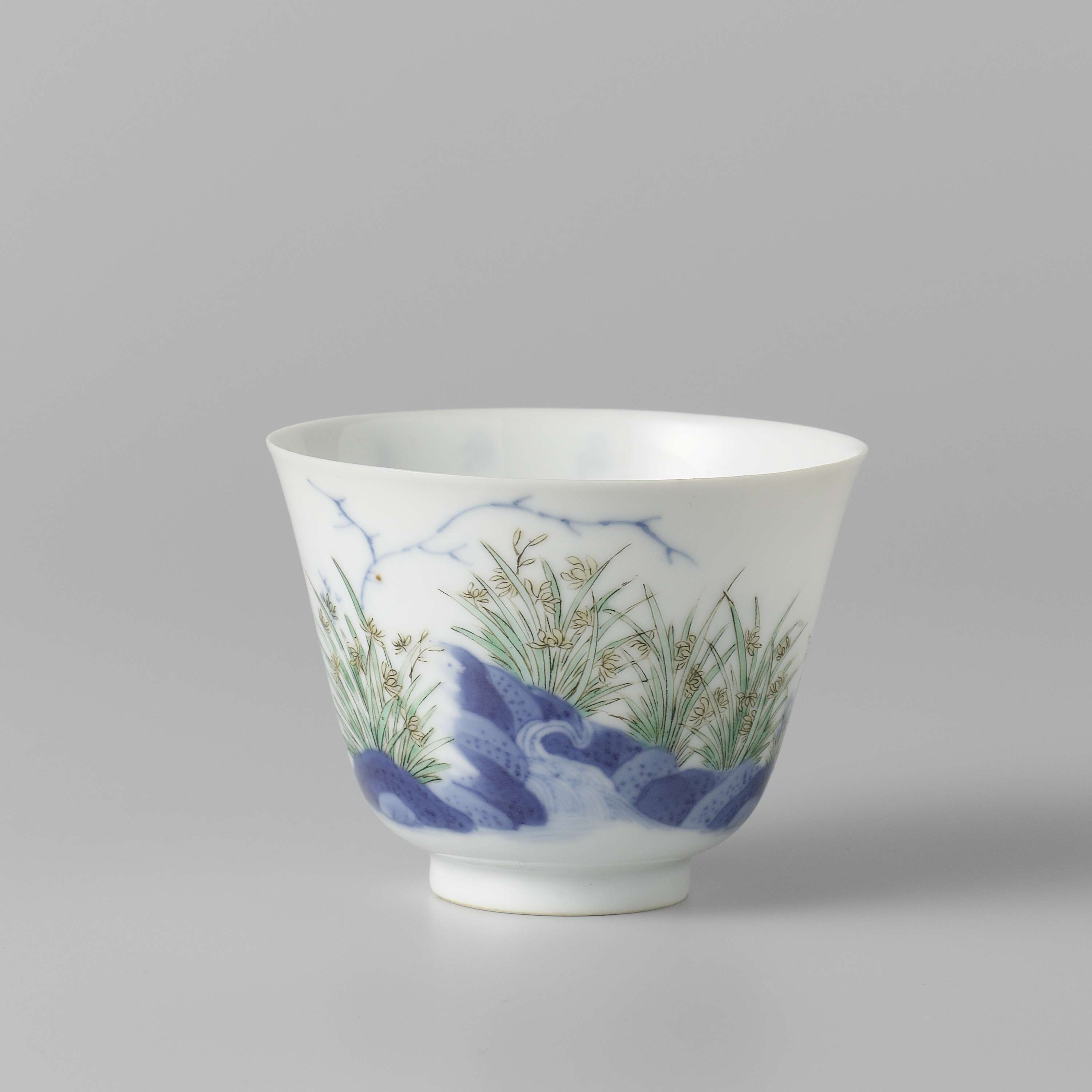 Klokvormige kop van porselein, beschilderd in onderglazuur blauw en op het glazuur blauw, rood, groen, geel, aubergine en zwart. Maandkopje van de tiende maand met op de buitenwand een orchidee en een tweeregelig gedicht afgesloten door het zegelmerk 'shang', waardering. Gemerkt op de onderzijde met het zes-karaktermerk van keizer Kangxi in een dubbele cirkel. Porselein met emailkleuren. (Nederlands)