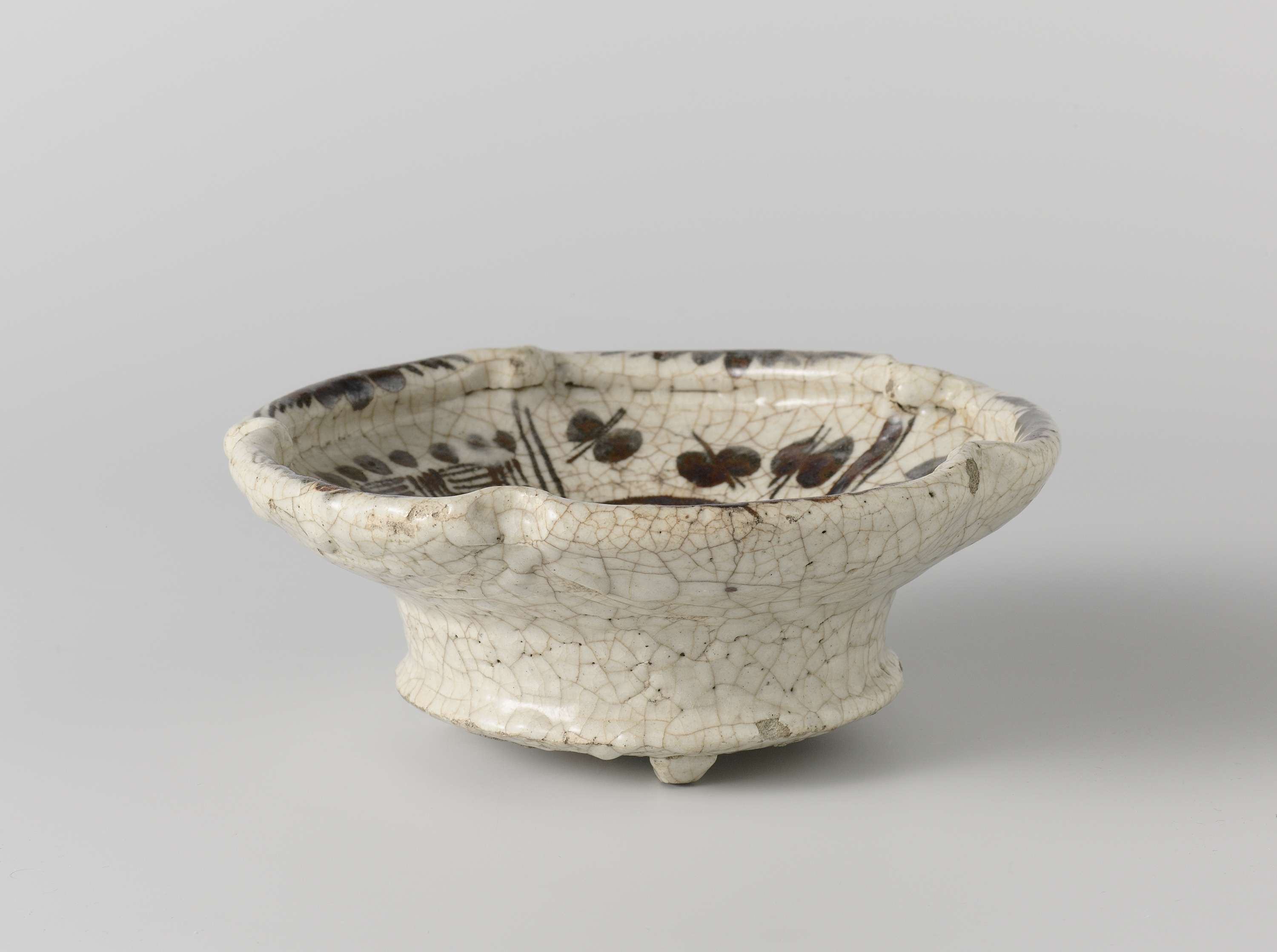 Schaal van steengoed op drie korte voeten en met vijfmaal ingeknepen, opstaande rand, bedekt met een crèmekleurig glazuur en beschilderd in onderglazuur bruin. Op de bodem geometrische motieven. De brede rand is verdeeld in vakken met arceerwerk en stippen. De opstaande rand met vijfmaal een gestileerde fruit- of bloemtak. Vijf proenen op de bodem; drie proenen op de onderzijde. Oud label op de onderzijde met 'W573'. Shino. (Nederlands)