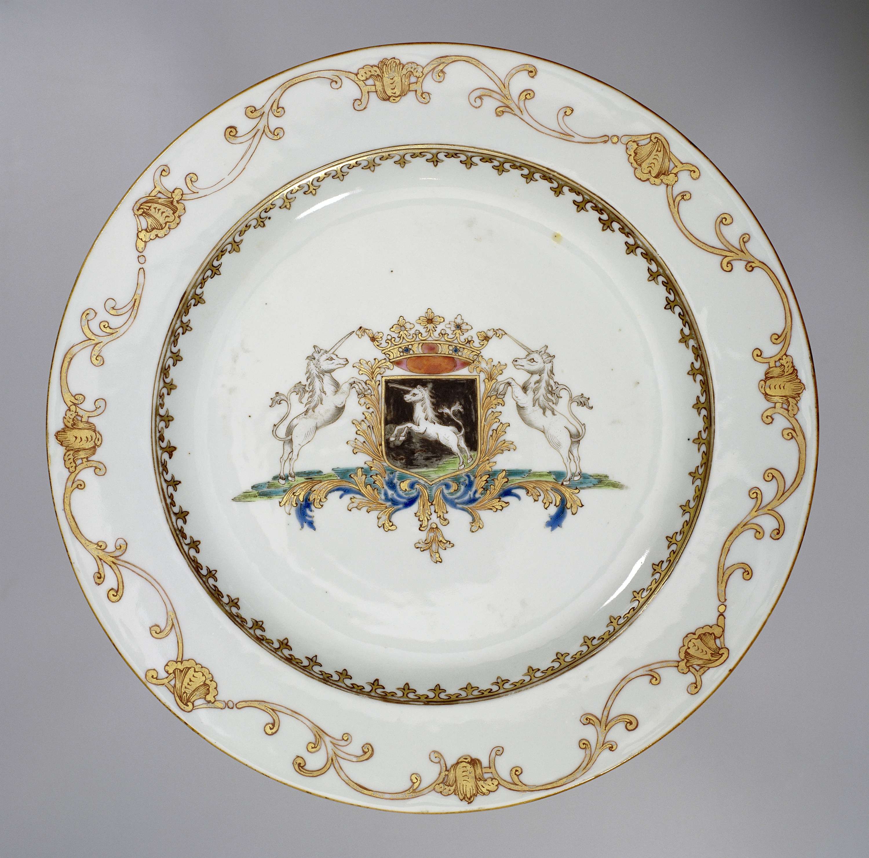 Bord van porselein, beschilderd op het glazuur in blauw, rood, roze, groen, zwart en goud. Op het plat het wapen van de familie Van Beeftingh. Het wapen heeft een zwarte achtergrond met daarop een eenhoorn afgebeeld. Het helmteken is een kroon. Aan weerzijde van het wapen staan twee eenhoorns afgebeeld, staande op een voetstuk van bladwerk. Op de wand een spearhead-border en op de rand een Europese decoratieve band met schelpmotieven en ranken. Wapenporselein met emailkleuren. (Nederlands)