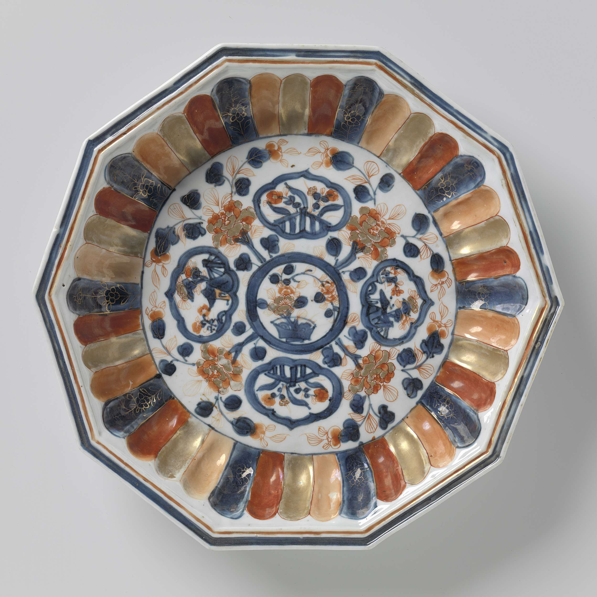 Schotel van porselein met geribde wand en platte rand, beschilderd in onderglazuur blauw en op het glazuur rood en goud. Op het plat een medaillon met een bloempot. Op het medaillon vier keer een pioenrank; tussen de ranken vier geschulpte cartouches met bloeiende planten achter een hekje. De ribben zijn verschillend gekleurd met op het blauw een bloemtak in goud. De rand met een blauwe en een rode band. Negen proenen op de onderzijde. Imari. (Nederlands)