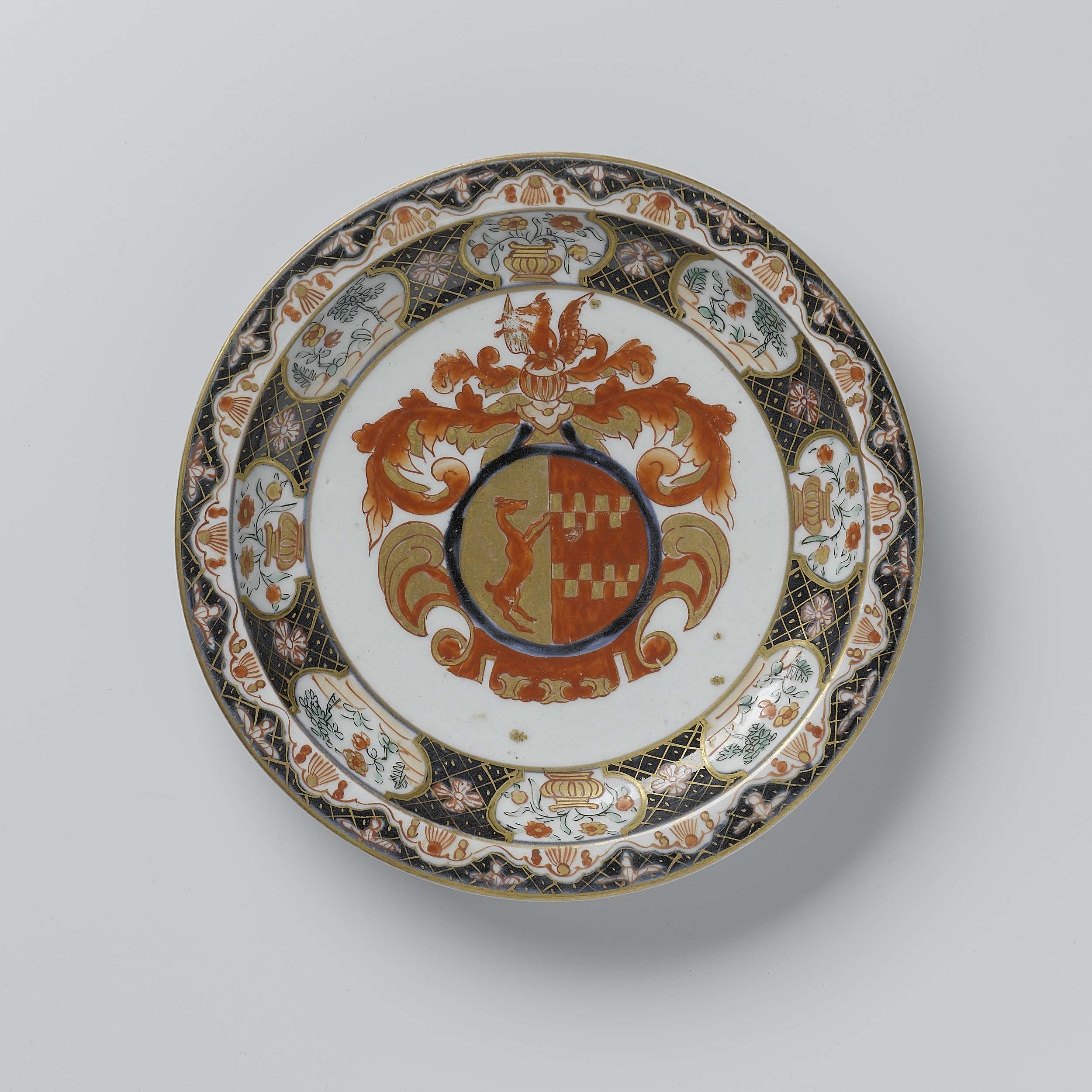 Bord van porselein, beschilderd in onderglazuur blauw en op het glazuur rood, groen, zwart en goud. Op het plat het familiewapen van Van Buren met links een windhond tegen een gouden achtergrond en rechts twee keer zeven gouden rechthoeken op een rode achtergrond. Het helmteken is een windhond met vleugels omgeven door acanthusbladeren. De wand met servetwerk met een gestileerde bloem, onderbroken door cartouches met een landschap of een bloemenvaas. De rand met een band met kwasten en een band met bladeren op servetwerk. Vier proenen op de onderzijde. Wapenporselein in Imari. Arita. (Nederlands)