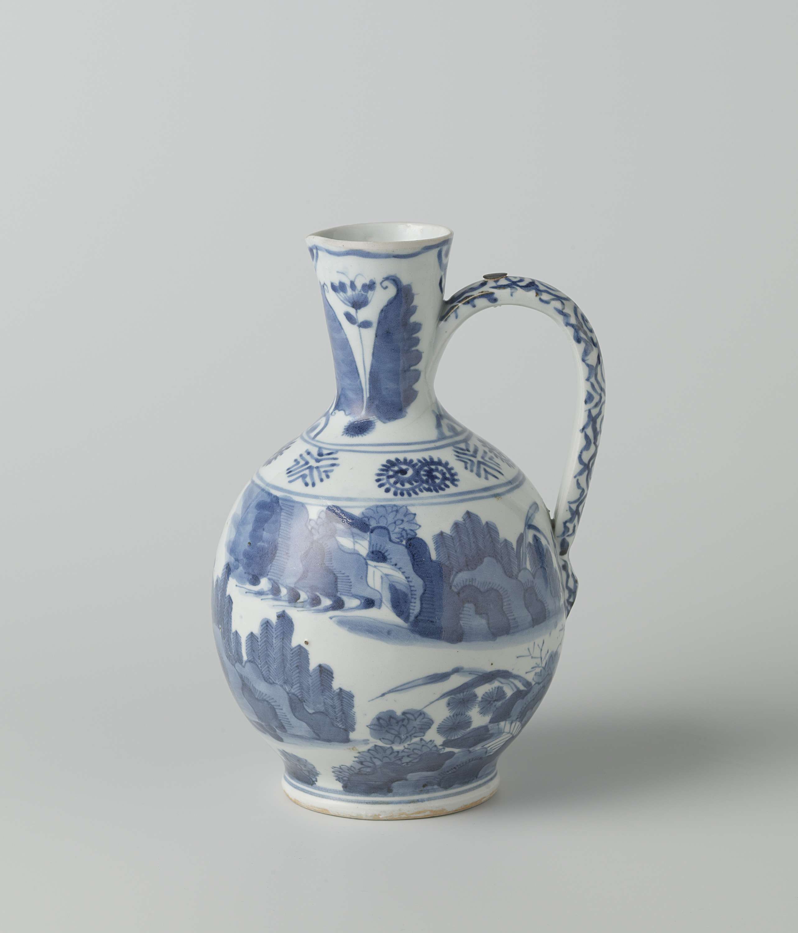 Schenkkan van porselein met een bolvormig lichaam, spreidende hals en c-vormig oor, beschilderd in onderglazuur blauw. Op de buik een doorlopend landschap met twee staande mensen tussen bomen, bloeiende planten en rotsen. De schouder met een decoratieve band. Op de hals twee keer een tulpmotief. Het oor met ranken; in het oor een metalen pen, waarschijnlijk van een deksel. Een chip in de rand; rand enigszins afgesleten, mogelijk door een nu ontbrekend montuur. Arita, blauw-wit. (Nederlands)