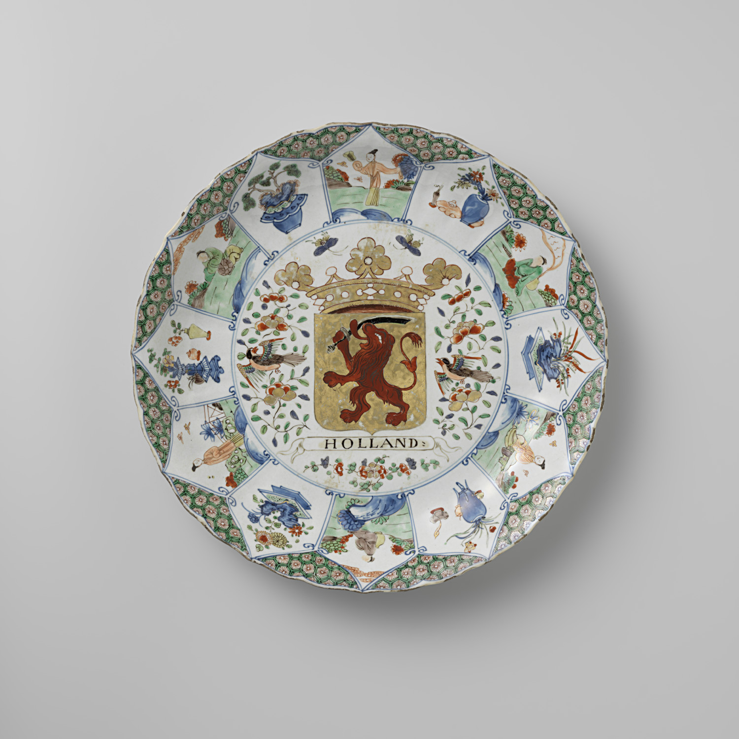 Schotel van porselein met geschulpte rand, beschilderd op het glazuur in blauw, rood, groen, geel, zwart en goud. Op het plat het wapen van Holland, met het opschrift 'HOLLAND', met aan weerszijden een bloemtak met vogel, boven het wapen twee insecten en onder het wapen een bloemtak; de wand en rand zijn verdeeld in twaalf bloembladvormige vakken afwisselend gevuld met een zittende man in een landschap, een staande vrouw in een landschap of bloemvazen; de rand met servetwerk. Op de achterzijde twee bloemtakken. Enkele chips in de rand. Wapenporselein met emailkleuren. (Nederlands)