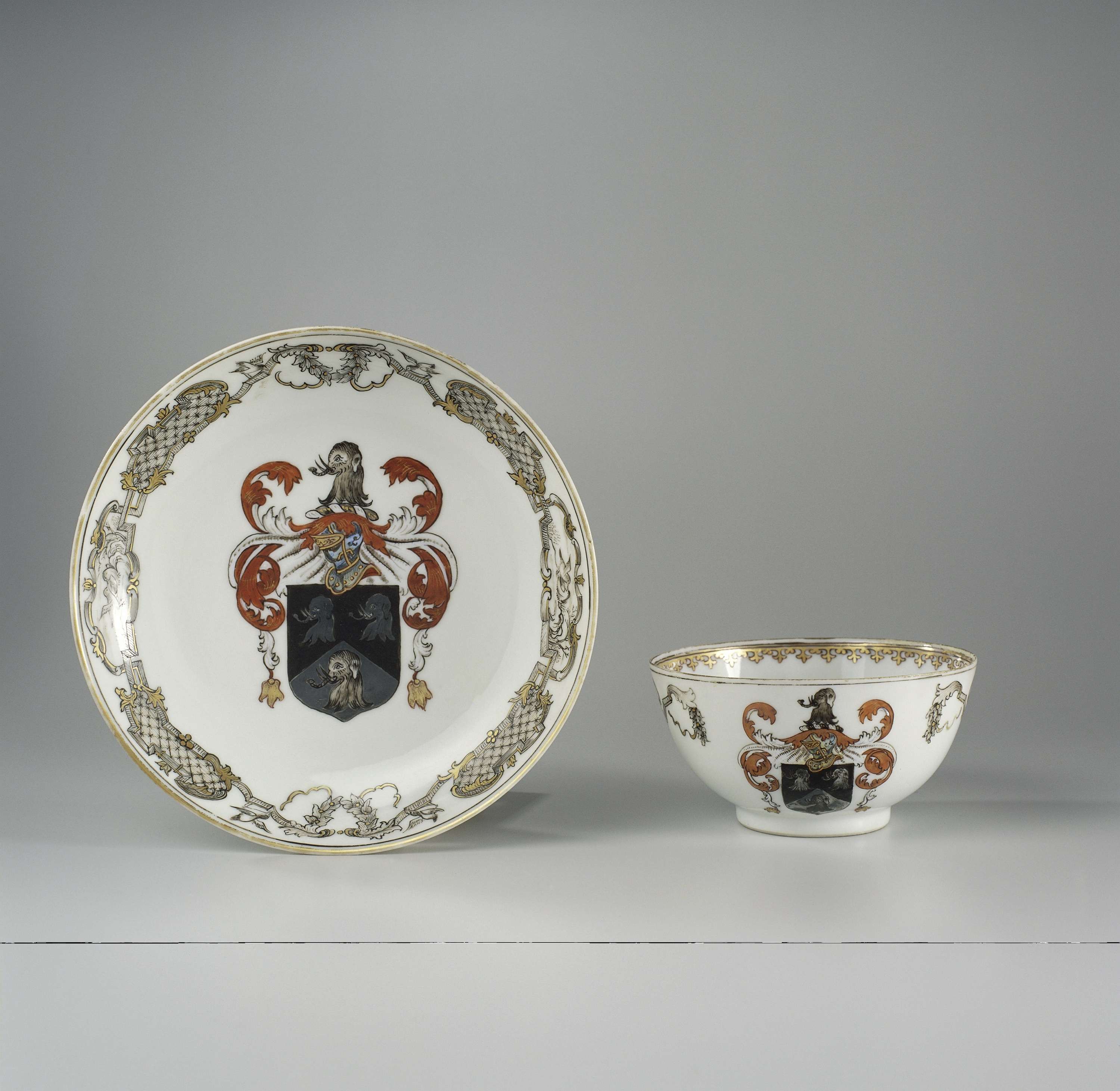 Wijde, rechtwandige kop en schotel, beschilderd in emails, encre de Chine en goud met het wapen van de familie Saunders en met een rand van Lodewijk de XIV-ornament. (Nederlands)