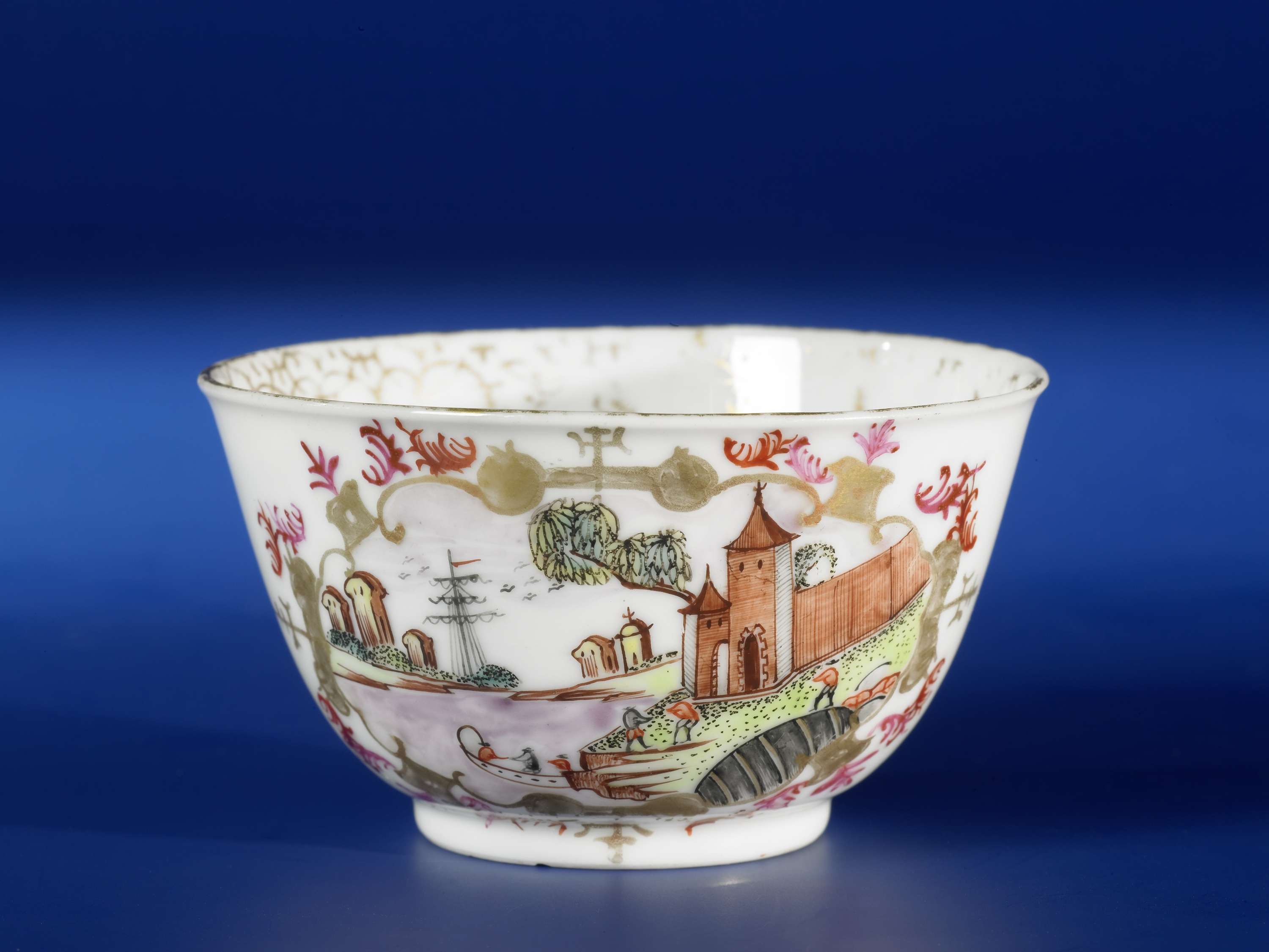 Klokvormige kop van porselein, beschilderd op het glazuur in rood, roze, groen, geel, paars, zwart en goud. Op de buitenwand twee cartouches met een Europees rivierlandschap met een boot en enkele werkende personen, op de achtergrond een fort, zeilschip en huizen; om het cartouche ranken in Meissen-stijl; de binnenrand met bloemranken. Een barst in de wand. Europese voorstelling in emailkleuren. (Nederlands)