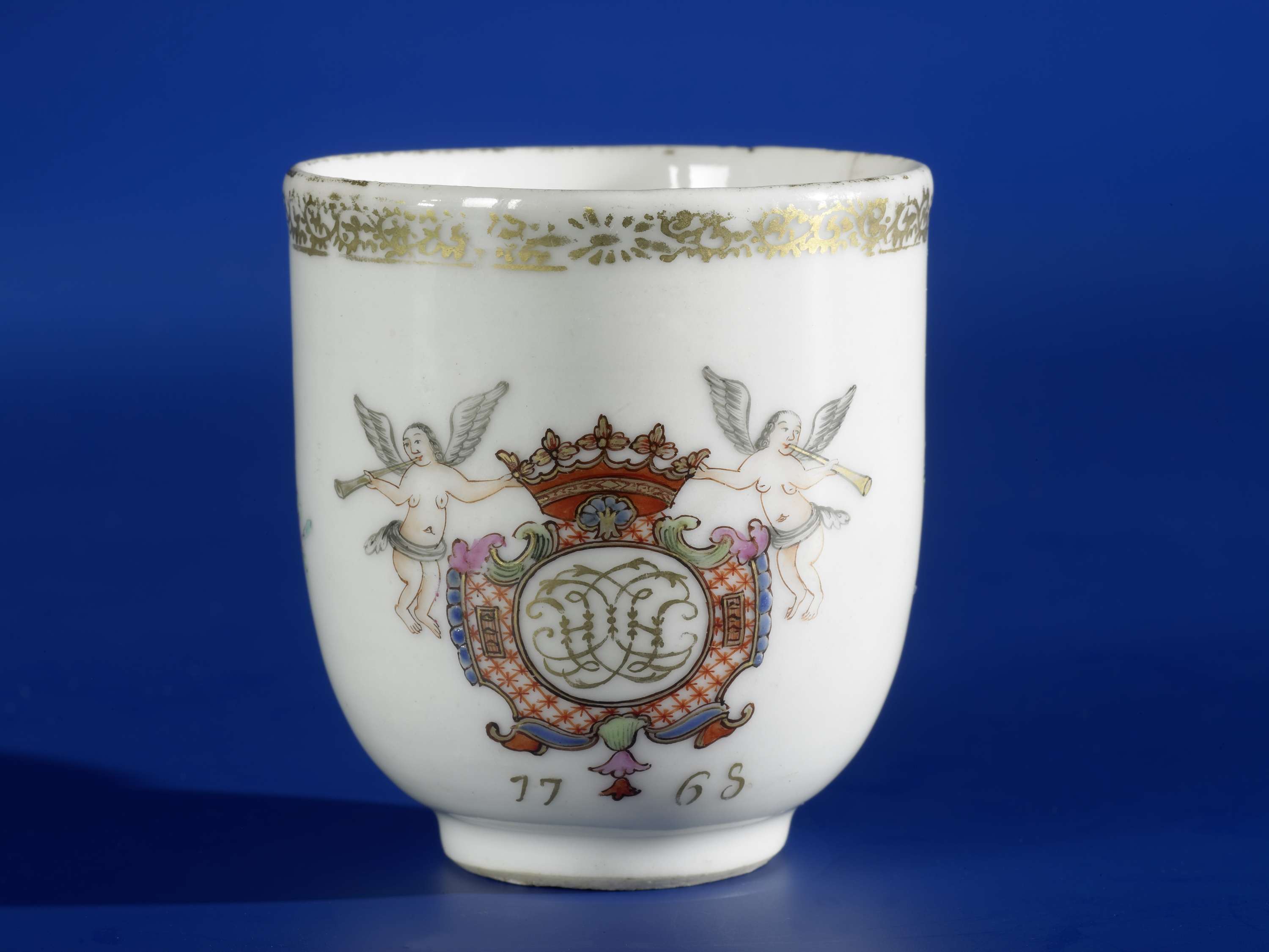 Smalle hoge kop op een voetring. Versierd in emailkleuren en goud met een monogram met de initialen CJHL binnen een cartouche. Onderaan het jaartal 1768, bovenaan een kroon. De kroon wordt vastgehouden door twee engelen die op een hoorn blazen. Bovenaan een bloemenrand. (Nederlands)