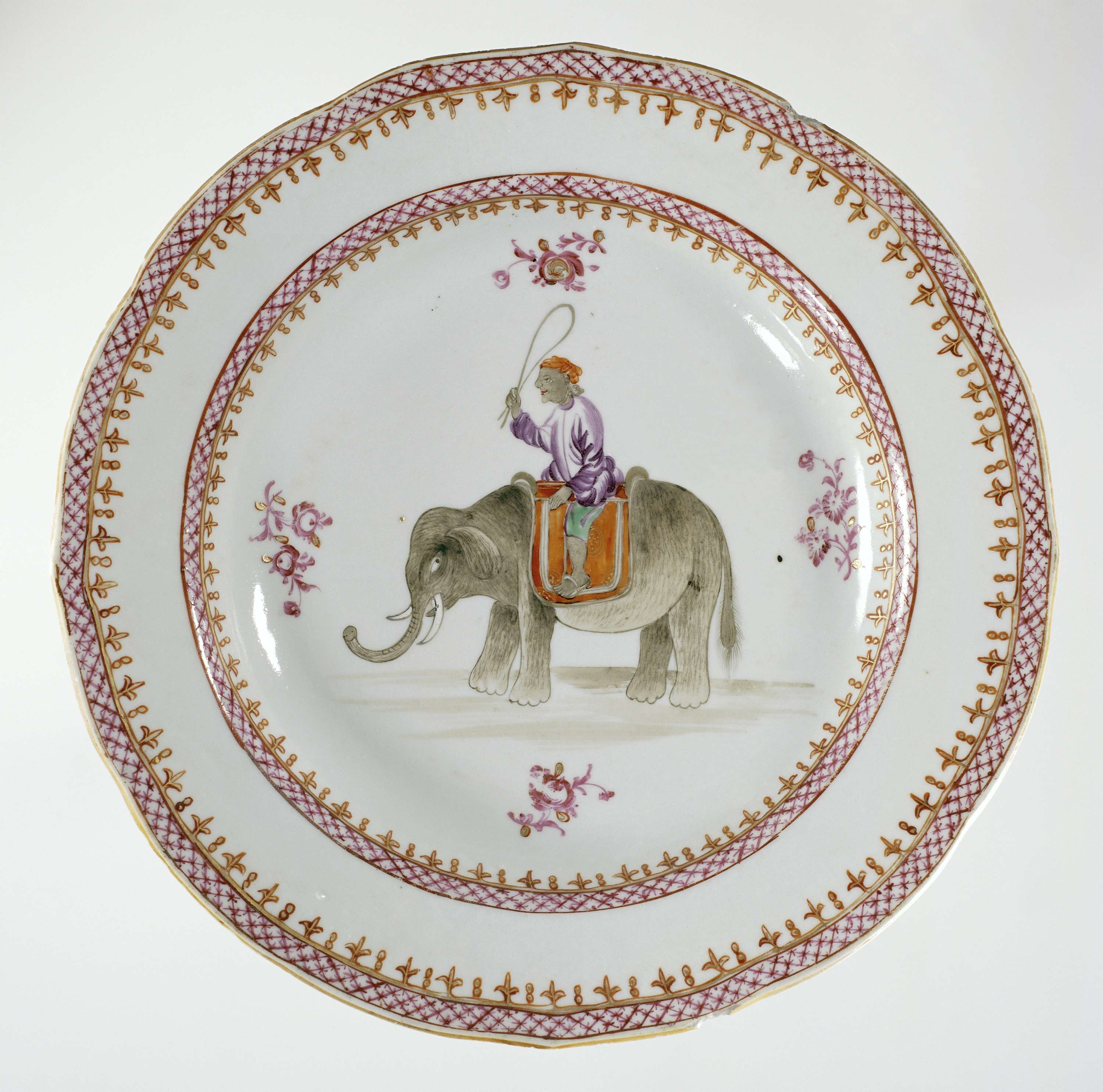 Bord op een voetring, met geschulpte rand. Gedecoreerd in emailkleuren. Centraal een afbeelding van een olifant, bereden door een kornak. Eveneens op het plat vier plukken bloemen. Rondom de voorstelling een fleur de lys-rand en een rand met een ruitpatroon. Op de rand eveneens een rand van fleur de lys en rand met een ruitpatroon. Porselein met dit ontwerp werd vooral geproduceerd voor de Britse koloniale families in India. Deze productie lag met name tussen 1760 en 1790. Waarschijnlijk kwam dit porselein via Engelse handelaren in Bombay en Madras naar Europa, of met repatriërende Engelsen in een latere periode. (Nederlands)