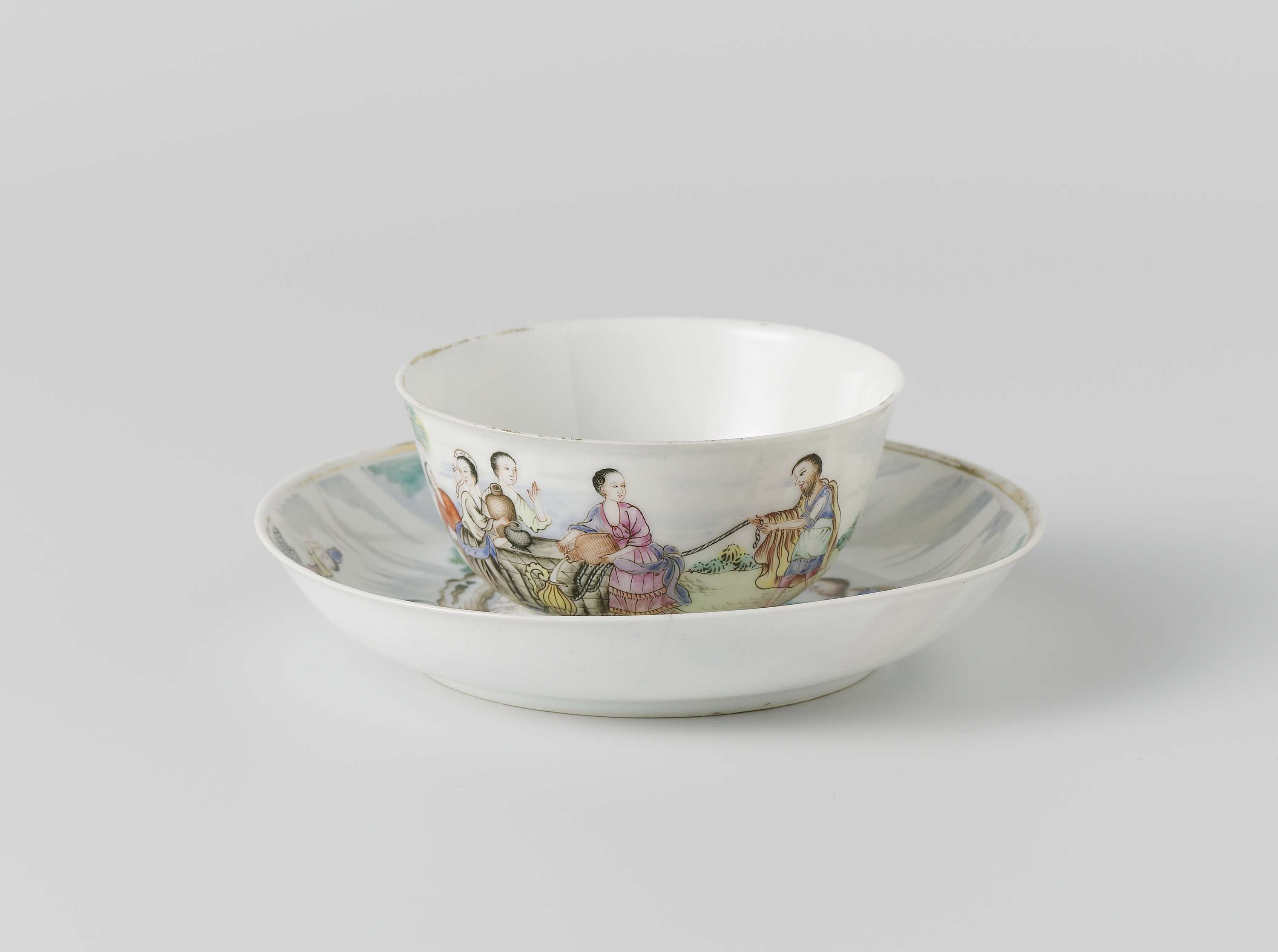 Klokvormige theekop en schotel van porselein, beschilderd op het glazuur in blauw, rood, roze, groen, geel, zwart en goud. Op het plat van de schotel een voorstelling van Rebecca bij de Bron; de voorstelling toont Rebecca met een groep jonge vrouwen bij de bron, naast Rebecca een man, Eliëzer, bediende van Abraham. De kop met dezelfde decoratie. Een barst in de wand van de schotel. Europese voorstelling in emailkleuren. (Nederlands)