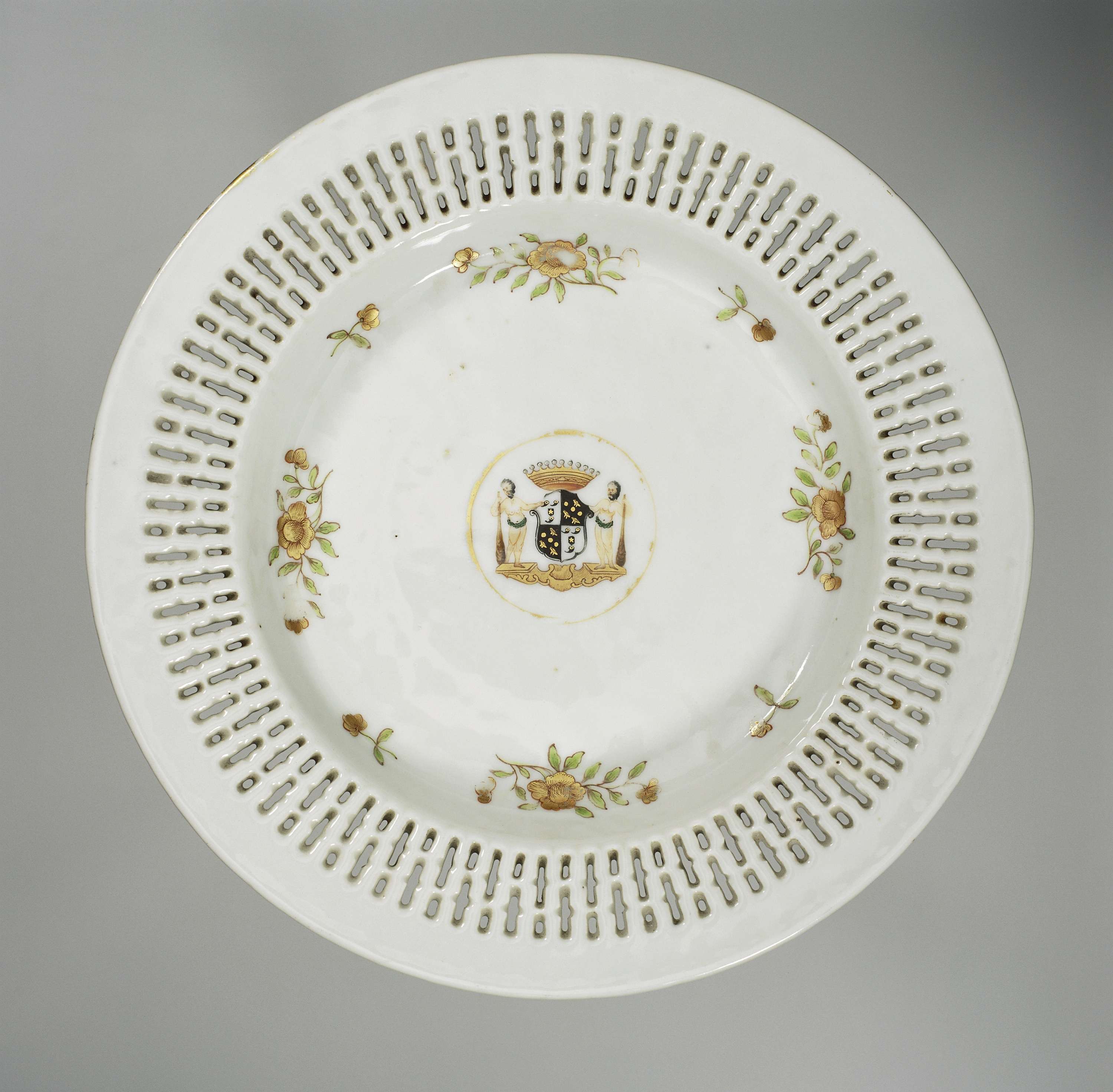 Bord van porselein met opengewerkte (ajourwerk) rand, beschilderd op het glazuur in rood, groen, bruin, zwart en goud. Op het plat in een medaillon het wapen van de familie Cornets de Groot in zwart en goud. Het wapen is verdeeld in vier delen: 1. en 4. drie hoorns met in het midden een hartschild met een zwarte achtergrond en een gouden ster, 2. en 3. op een zwarte achtergrond drie gouden byzantijnen of ballen en drie kraaien. Boven het wapen is een kroon met elf parels afgebeeld. Aan weerszijden van het schild staan twee wildemannen die een knots vasthouden. Het geheel wordt ondersteund door een voetstuk in rococo-stijl. Op de wand vier bloemtakken en vier losse bloemen. Wapenporselein met emailkleuren. (Nederlands)