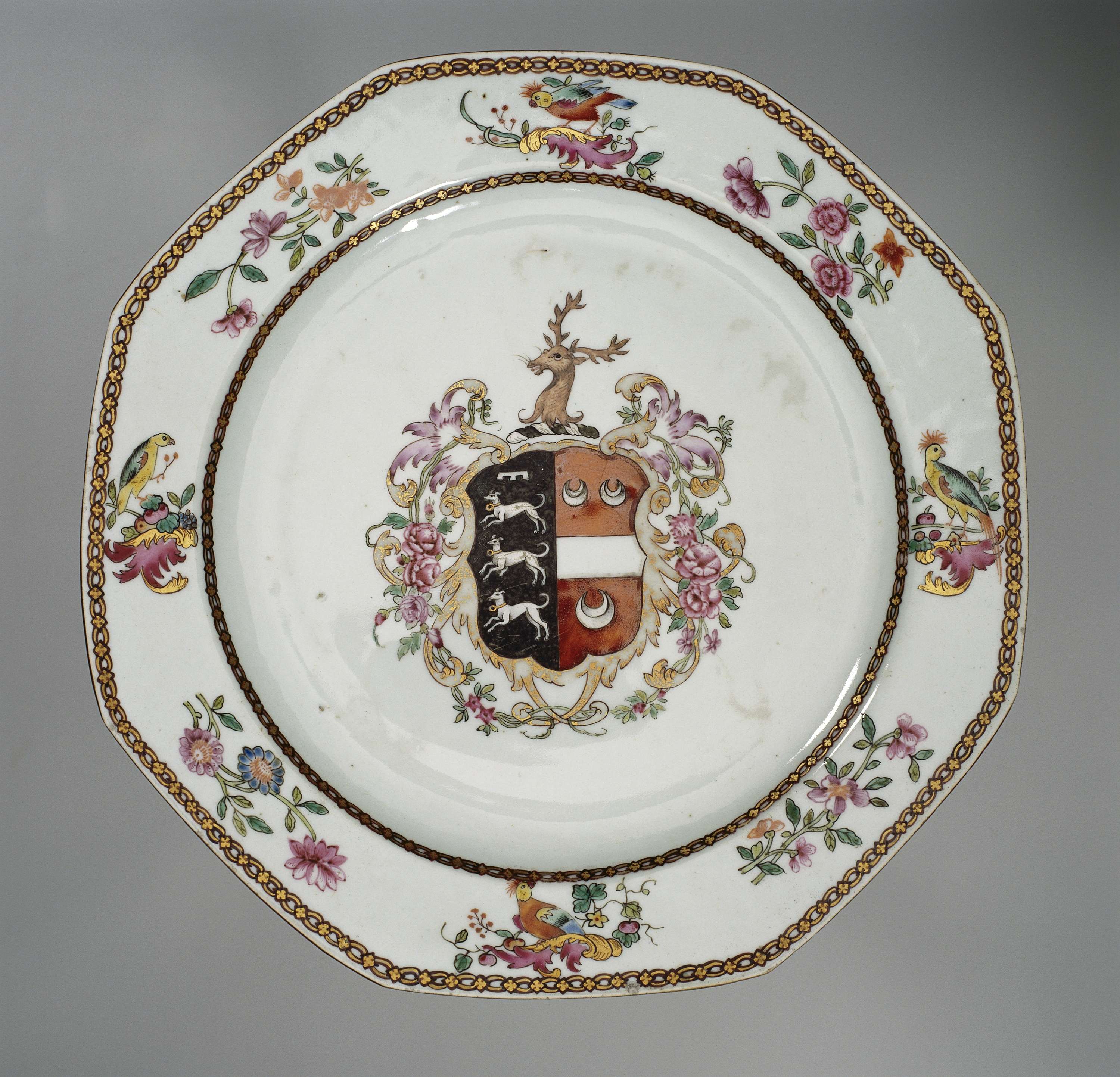 Achthoekig bord van porselein, berschilderd op het glazuur in blauw, rood, roze, groen, geel, zwart en goud. Op het plat het wapen van de families Machell en Holloway omgeven door bloemranken. Het helmteken is een hertenkop. Op de wand een band met schakelmotief; de rand met bloemtakken, vogels op een bladrank en een schakelmotief. Wapenporselein met emailkleuren. (Nederlands)