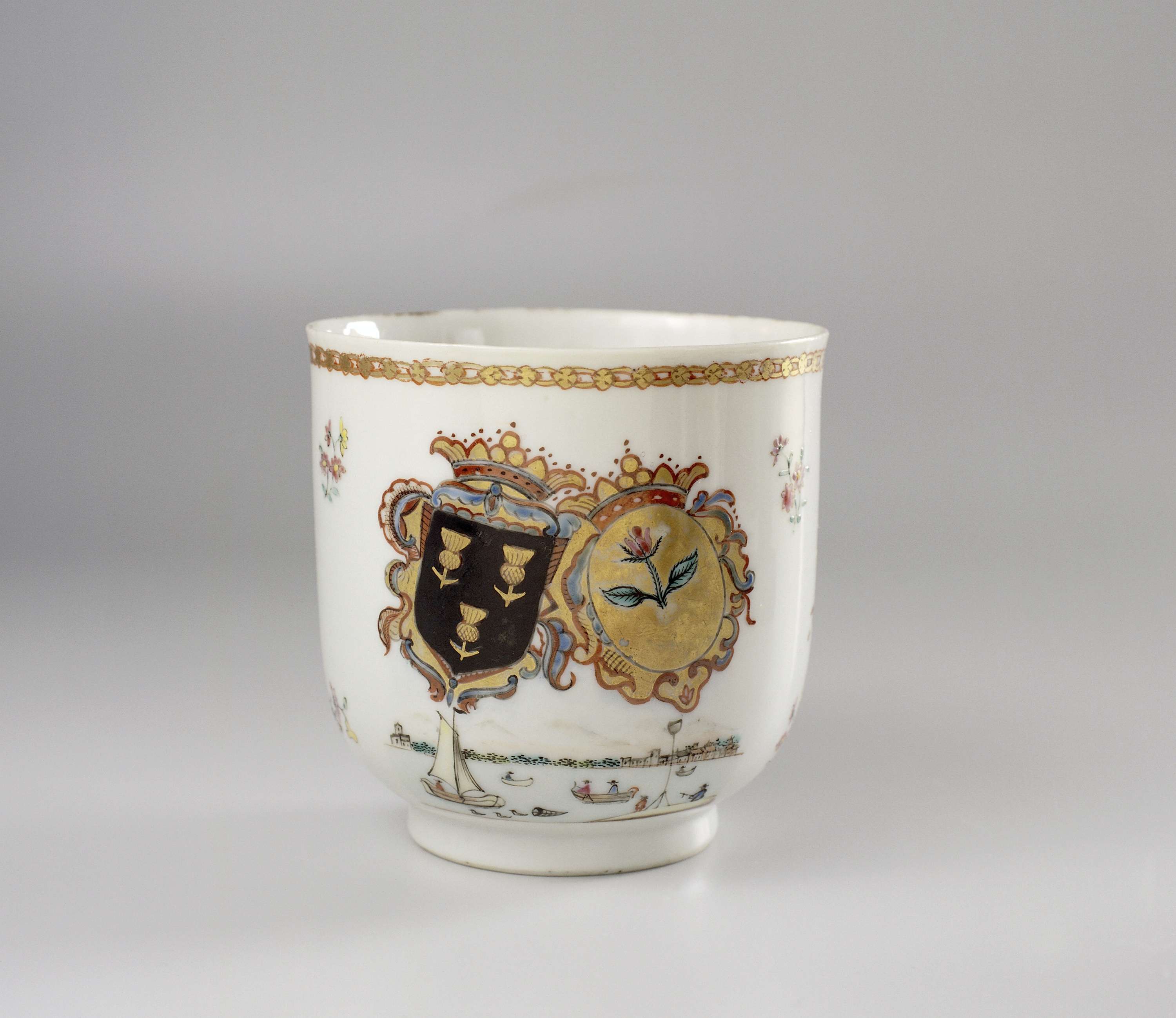 Oorkop van porselein, beschilderd op het glazuur in blauw, rood, roze, groen, geel, zwart en goud. Op de buitenwand het alliantiewapen van de families Van Blommenstein en De Roos. Het wapen links van de familie Van Blommenstein heeft een zwarte achtergrond met drie gouden distels of afrikaantjes. Het wapen links van de familie De Roos heeft een gouden achtergrond met roos. Bij beide families is boven het wapen een kroon afgebeeld in rood en goud en het dekkleed bestaat uit krulwerk in rococo-stijl. Onder het geheel is een (waarschijnlijk Nederlands) riviergezicht met een haven, vissersboten, huizen, een kerk en heesteraanleg afgebeeld. Aan weerszijden van het wapen strooibloemen en op de rand een schakelpatroon. Wapenporselein met emailkleuren. (Nederlands)