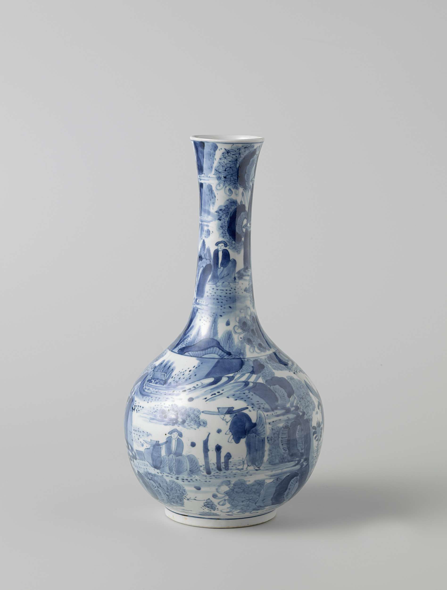 Flesvormige vaas van porselein met kogelvormige buik en iets uitlopende hals, beschilderd in onderglazuur blauw. Op de buik een doorlopend landschap met groepjes mensen tussen rotsen, bomen en planten: twee personen onder een parasol, de één wijst naar iets waar de ander naar kijkt; drie personen, een met een wandelstok; een staand persoon, die voorover buigt naar twee zittende personen. In de achtergrond een huis. Op de hals een doorlopend landschap met een zittend persoon en twee staande personen, één met een vaandel en de ander met een soort vaas. Een proen op de onderzijde. Arita, blauw-wit. (Nederlands)