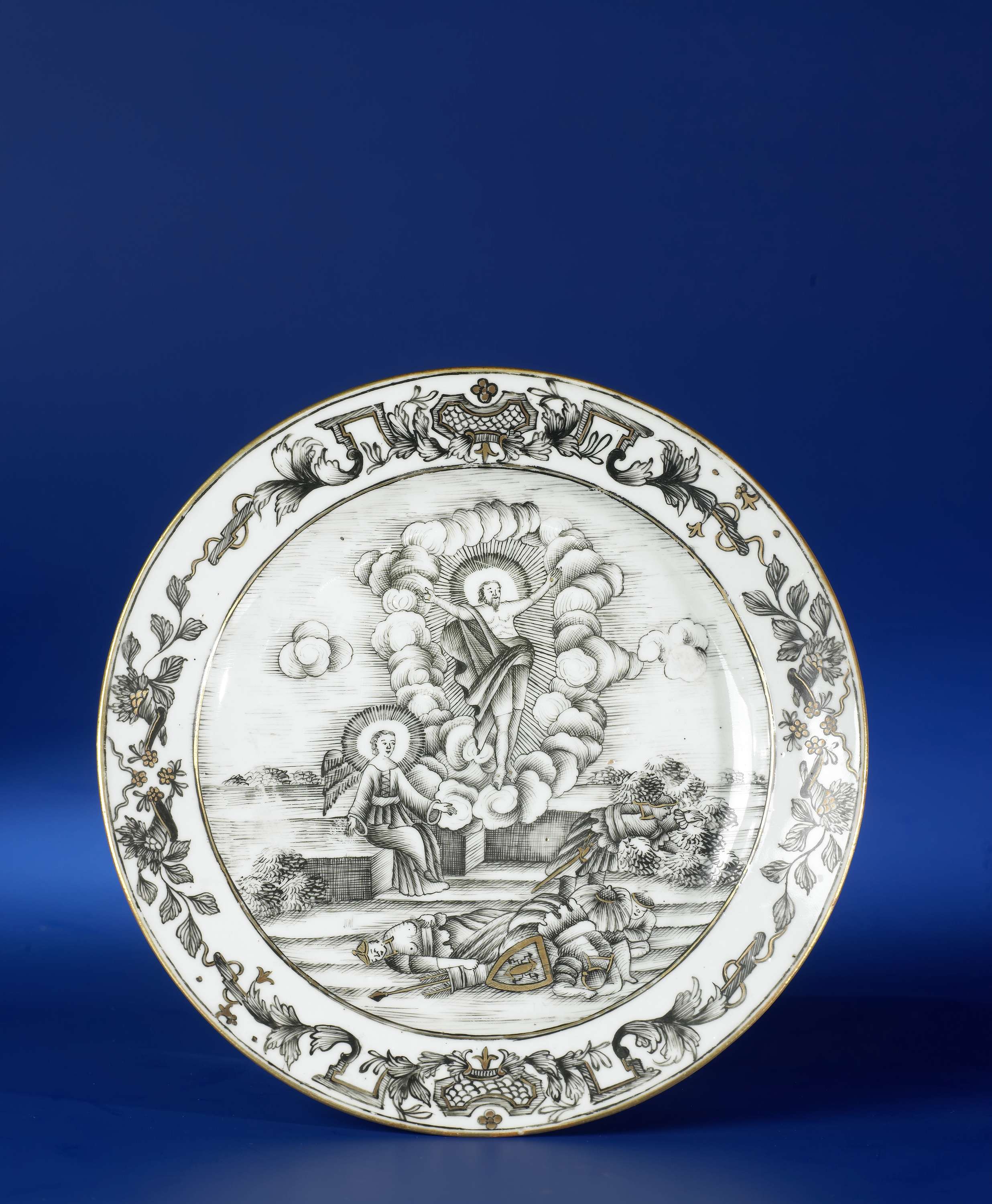 Bord van porselein, beschilderd op het glazuur in zwart en goud. Op het plat een voorstelling van de Opstanding van Christus, met een engel zittend op zijn graf en op de voorgrond de in slaap gevallen soldaten; de rand met een decoratieve band in de stijl van het Weense Du-Paquier porselein. De voorstelling is gebaseerd op een prent van Jan Luyken (1649-1712). Europese voorstelling in encre de Chine. (Nederlands)
