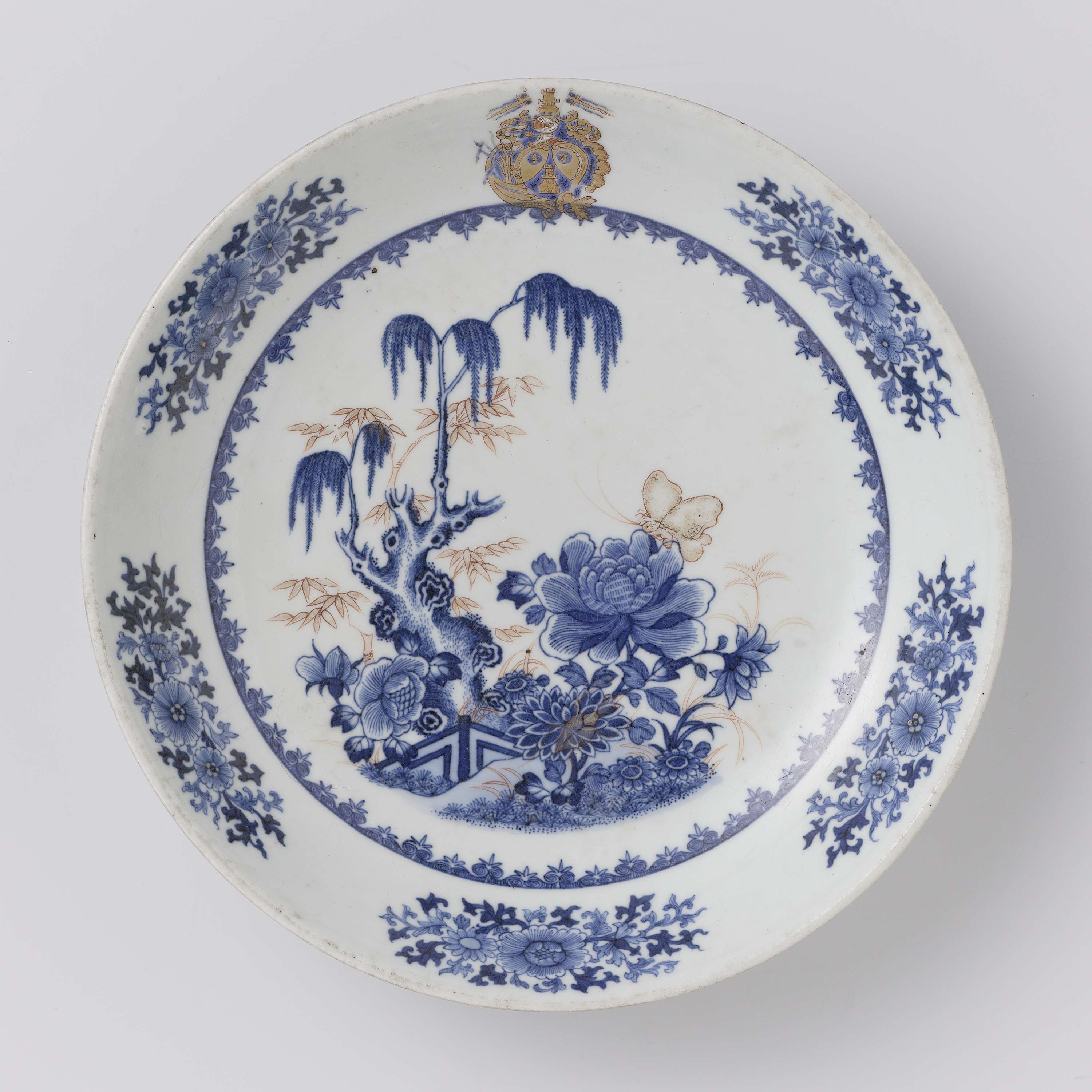 Diep bord beschilderd in onderlgzuur blauw en enig ijzerrood. In het plat een wilg en een pioenroos bij een hek, omgeven door een spearhead band. In de rand vijf bloemtakken en een familiewapen in goud en blauw email. (Nederlands)