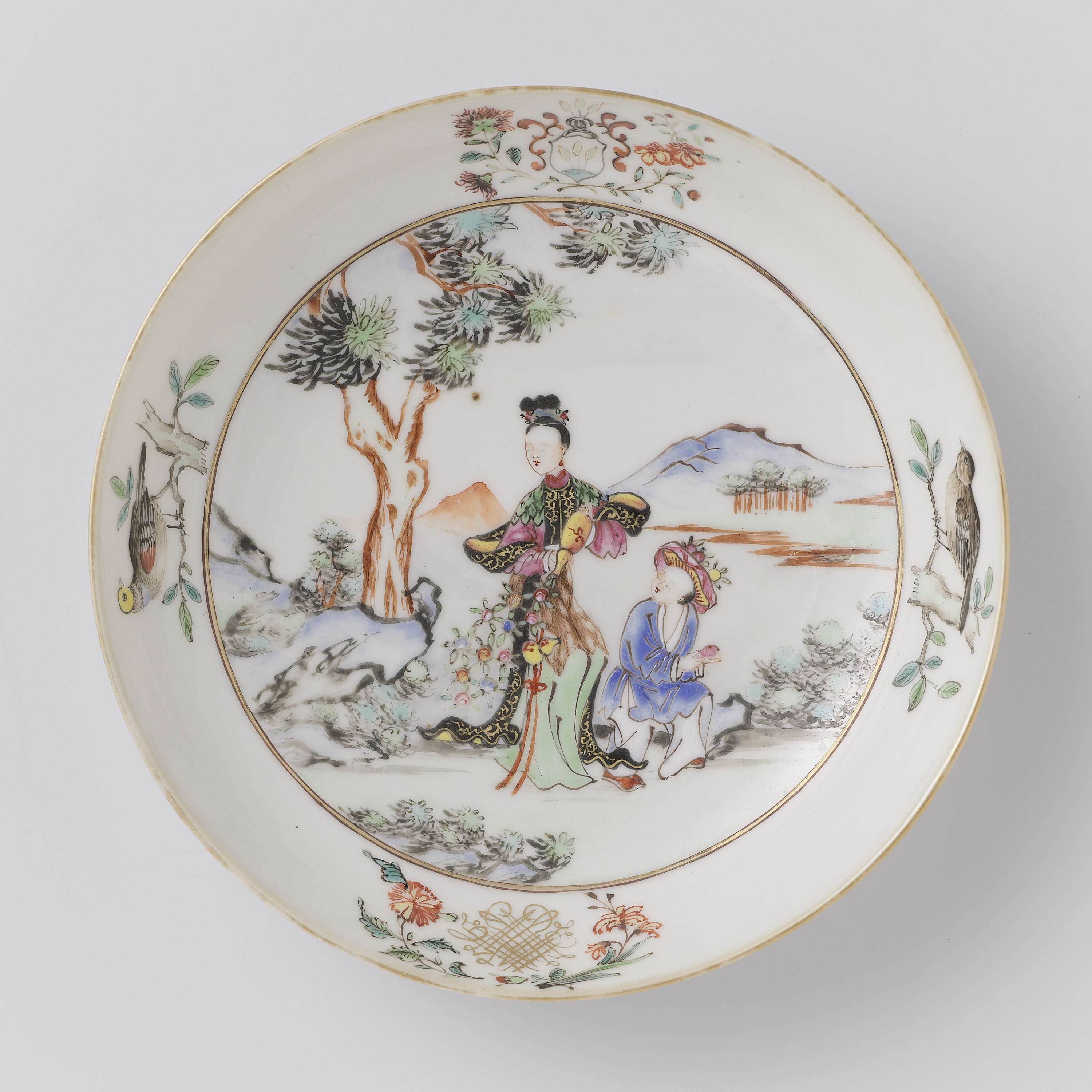 Saucer with two figures in a landscape, a coat of arms and a monogram (Engels)
