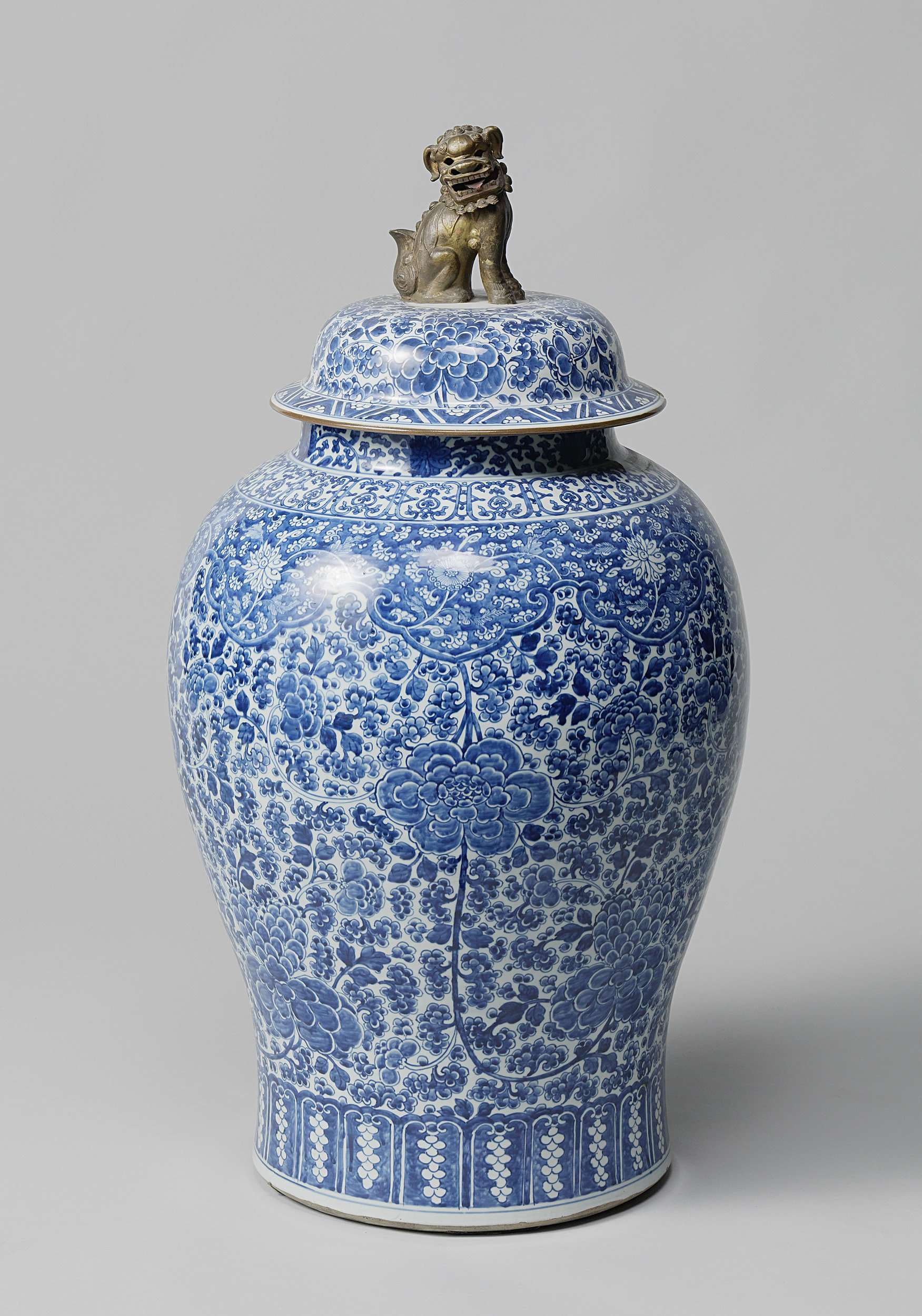 Balustervormige dekselpot van porselein, beschilderd in onderglazuur blauw. Het lichaam is volledig bedekt met een doorlopende bloemrank (pioen). Op de schouder een band met lambrequins met uitgespaarde bloem- en lotusranken tegen een blauwe achtergrond. Boven de voet een band met gestileerde bladmotieven. De nek met lotusranken. De deksel met bloemranken; dekselknop in de vorm van een vergulde, bronzen shishi. Gemerkt op de onderzijde met een ingegrift Johanneumnummer 'N393' boven een golvende lijn. Blauw-wit. (Nederlands)
