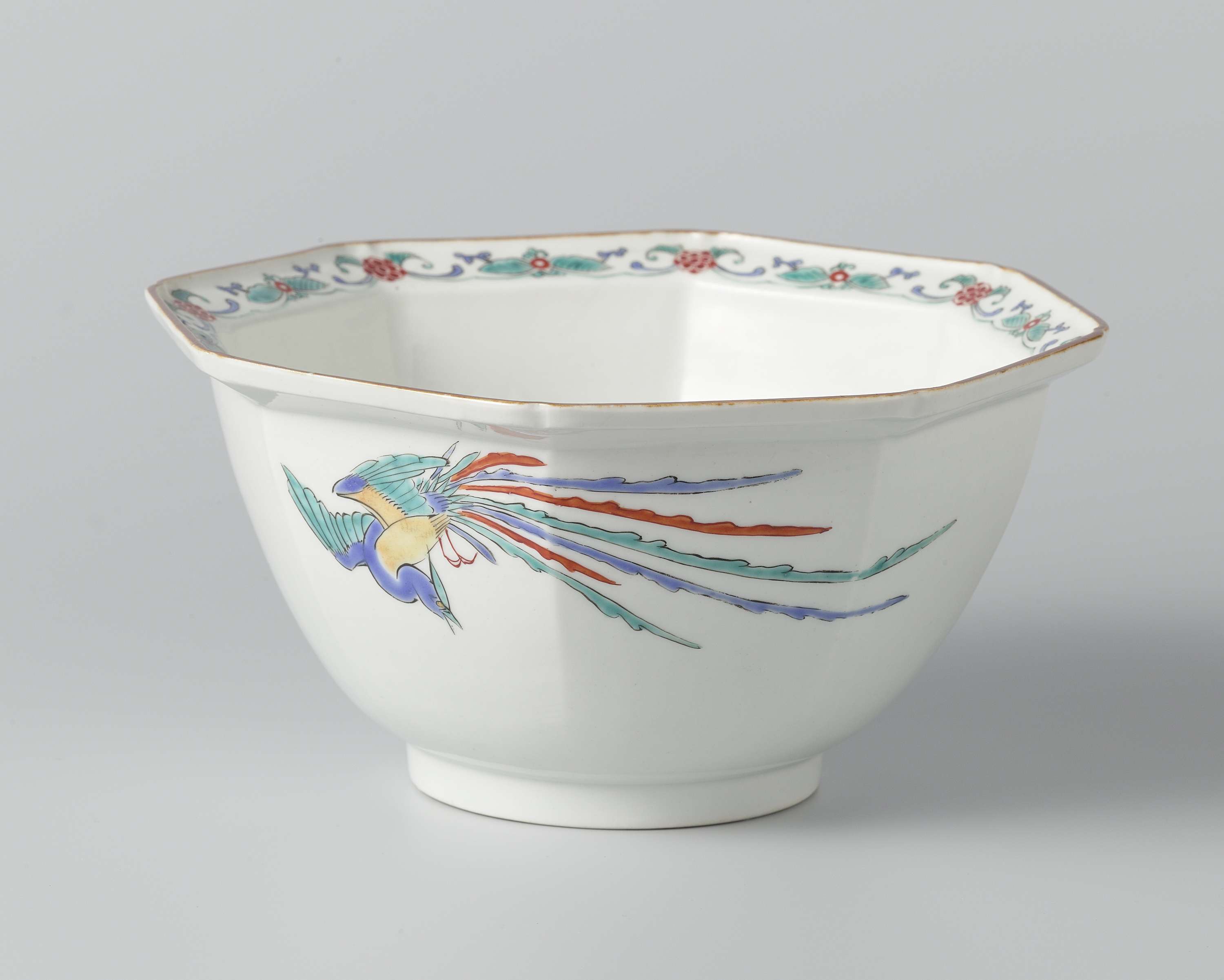 Achthoekige kom van porselein met uitstaande mondrand, beschilderd op het glazuur in blauw, rood, groen, geel en zwart met op de buitenwand een hôô aan de ene kant en een prunustak aan de andere, op de binnenkant op de bodem twee pompoenen met bladeren, op de rand symmetrische bloem- en bladranken. Bruine rand. Kakiemon. (Nederlands)