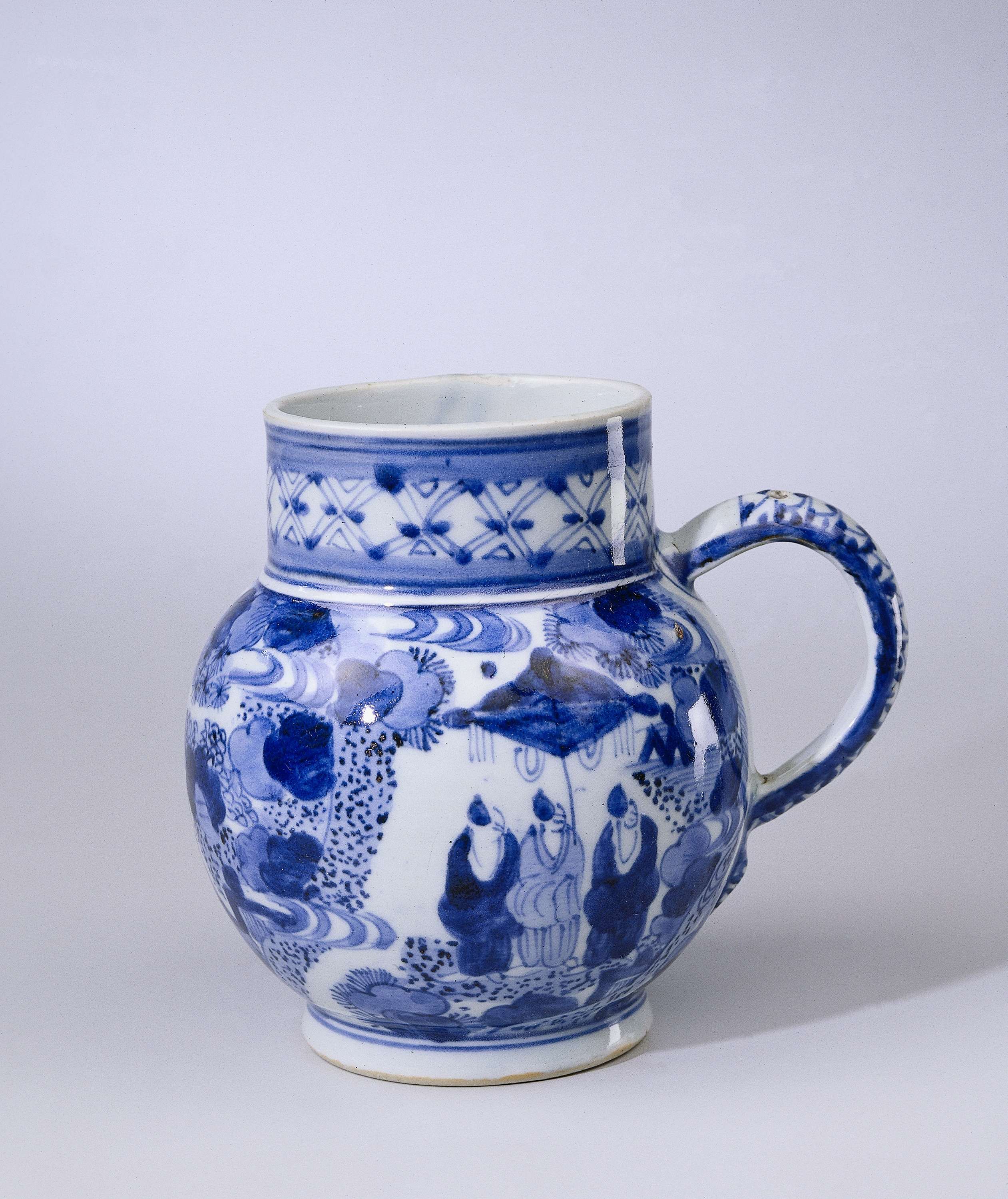 Bierpul van porselein, met een bolvormig lichaam en c-vormig oor. Op de buik een doorlopend landschap met twee paar figuren met een waaier, met daarnaast nog drie figuren onder een parasol bij bloeiende planten en rotsen. De rand met een brede band servetwerk. Op het oor een decoratief patroon; een gat bovenin het oor voor een ontbrekend montuur. De decoratie is in navolging van het Chinese overgangsporselein. Blauw-wit. (Nederlands)