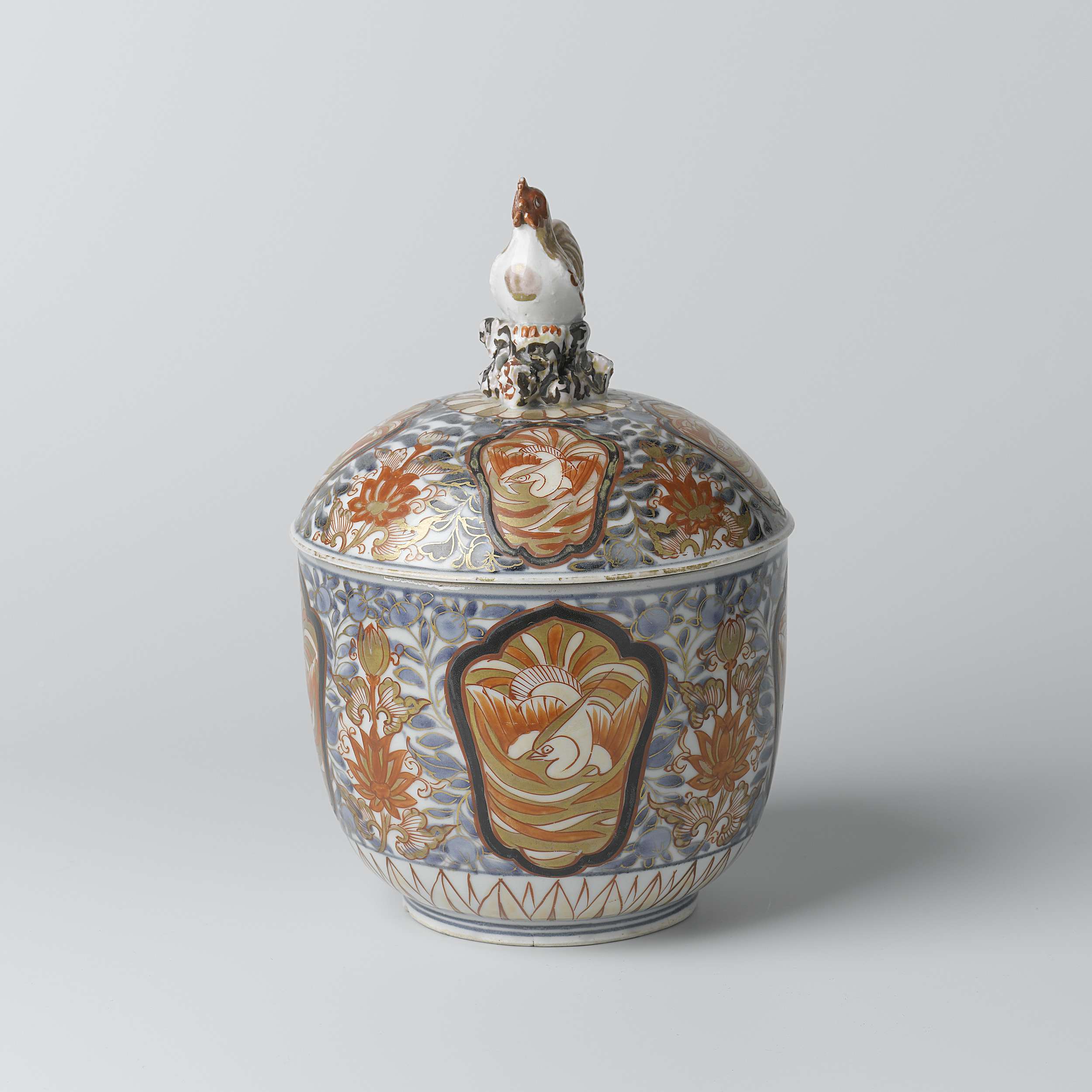Pot met deksel veelkleurig beschilderd met bloemen en vier medaillons met vogels. Op het deksel een haan als knop. Imari porselein. (Nederlands)