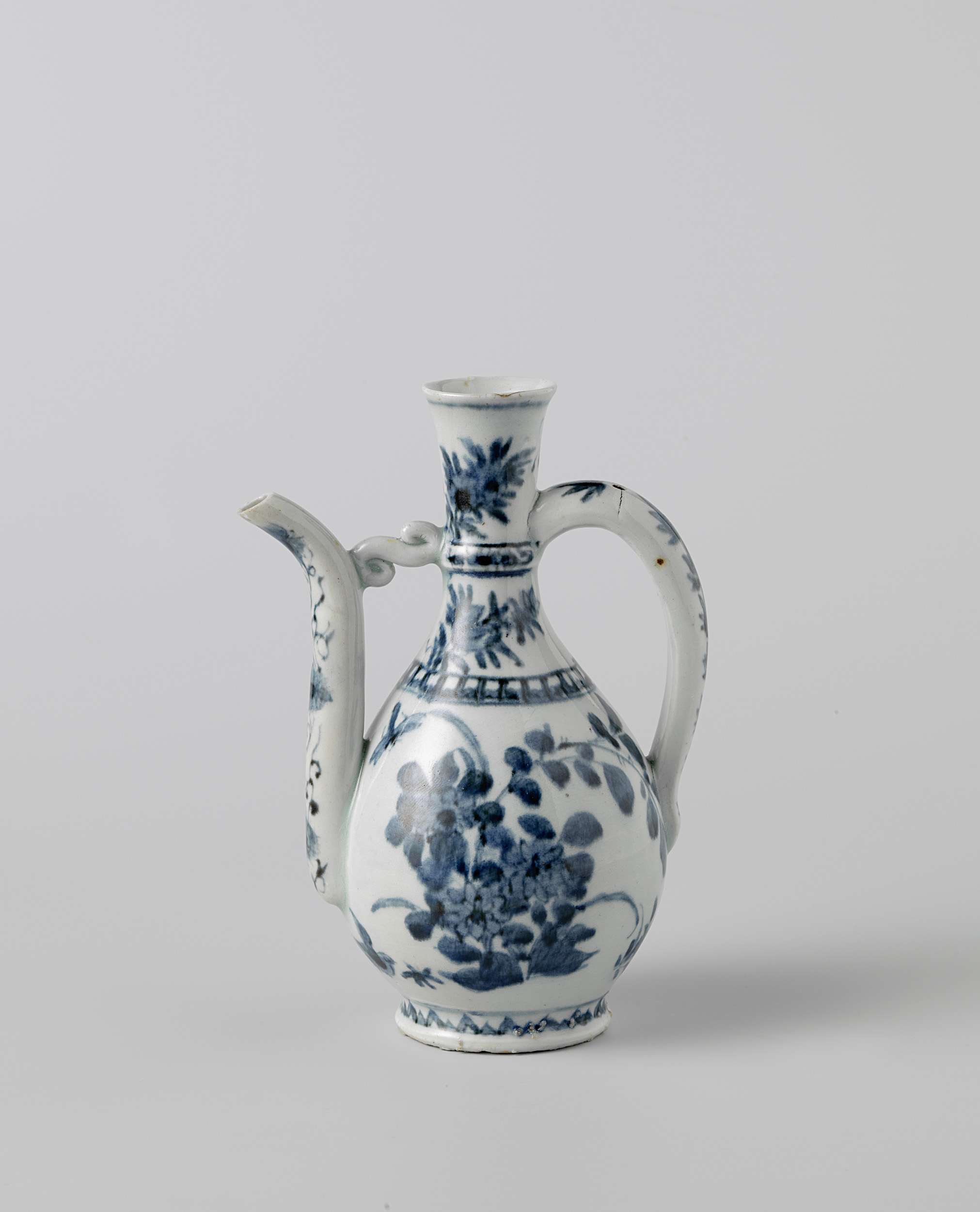 Kan van porselein met een peervormig lichaam, c-vormig oor en gebogen tuit bevestigd aan de hals, beschilderd in onderglazuur blauw. Op de buik tweemaal een groep bloeiende planten met een vogel en insecten. De schouder met een decoratieve band en twee bloemtakken. Op de hals een band met bloemranken, twee bloemtakken en een vlinder. De tuit met bloemranken en het oor met een bladertak. Rond de voet een decoratieve band. Bovenop het oor een gat voor een montuur. Bakzand aan de voetring; een chip in de rand en in de tuit. Arita, blauw-wit. (Nederlands)