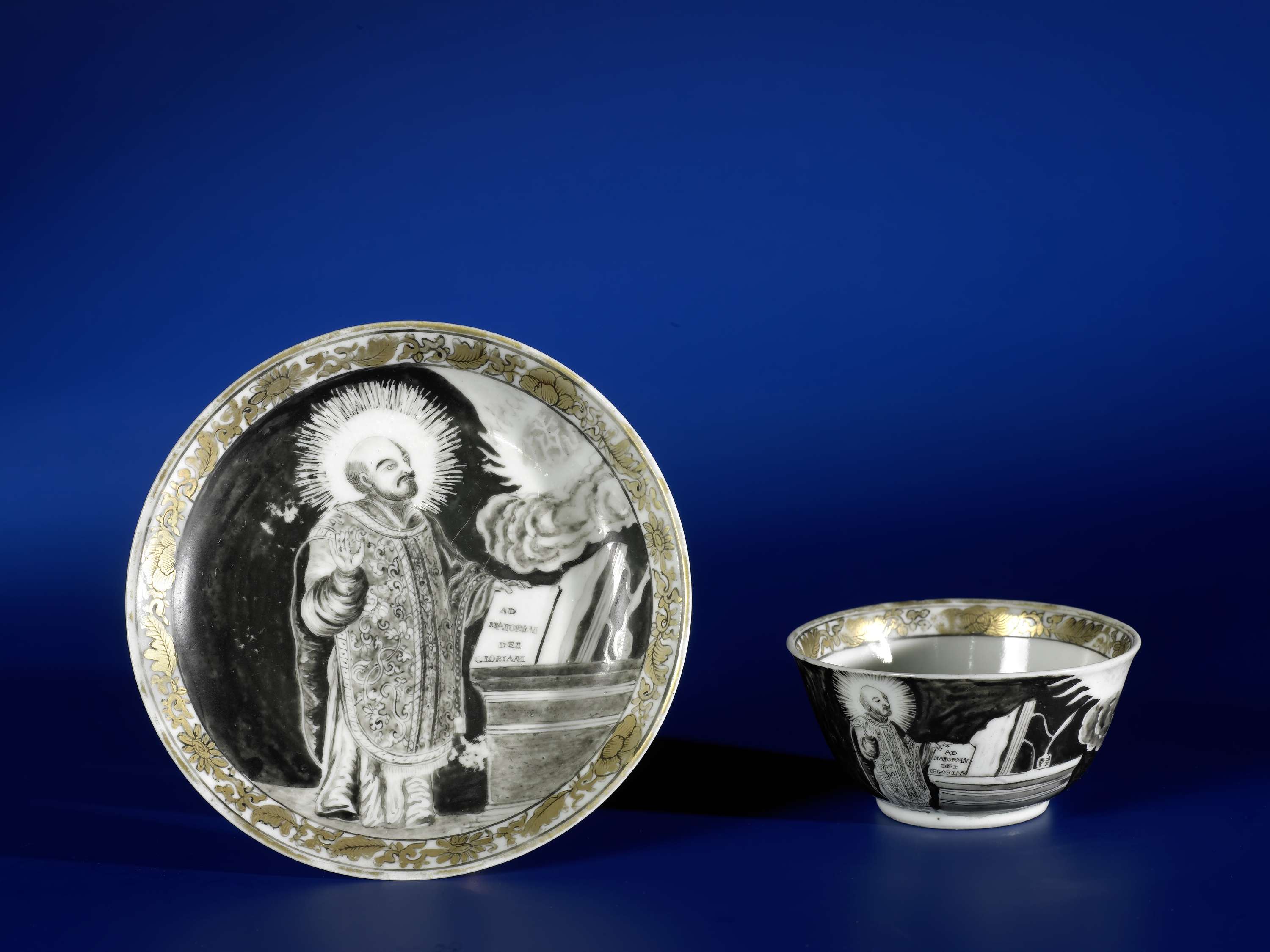 Klokvormige kop en schotel van porselein, beschilderd op het glazuur in zwart en goud. Op het plat van de schotel een voorstelling van Ignatius de Loyola met zijn linkerhand op een boek, de andere hand is geheven en hij kijkt naar een verschijning 'IHS' in de lucht, op het boek het opschrift 'AD MAIOREM DEI GLORIAM'. Een barst in de wand van de schotel; een barst en een chip in de rand van de kop. Europese voorstelling in encre de Chine. (Nederlands)